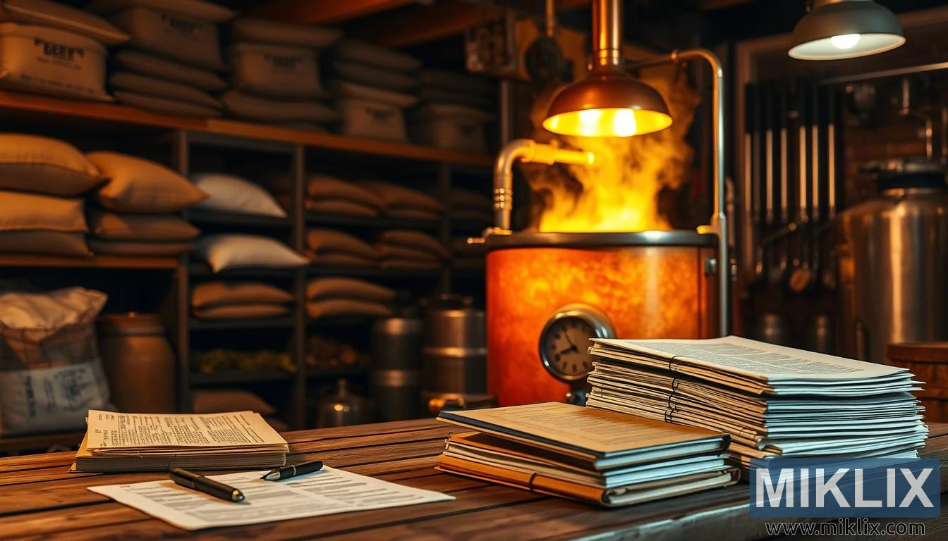 Im Vordergrund prägt ein stabiler Holztisch die Szenerie, dessen Oberfläche durch jahrelangen Gebrauch glatt geworden ist. Darauf liegt ein Stapel Braunotizen, Rezeptbücher und lose Blätter – Zeugnisse der intellektuellen und kreativen Arbeit, die dem Brauprozess zugrunde liegt. Daneben liegt ein Stift, bereit für Anmerkungen oder Überarbeitungen, und deutet auf die laufende Verfeinerung von Rezepten und Techniken hin. Dieser Tisch ist mehr als nur ein Arbeitsplatz; er ist ein Ort der Kontemplation und des Experimentierens, an dem Ideen getestet, Aromen ausbalanciert und die Vision des Brauers Gestalt annimmt.