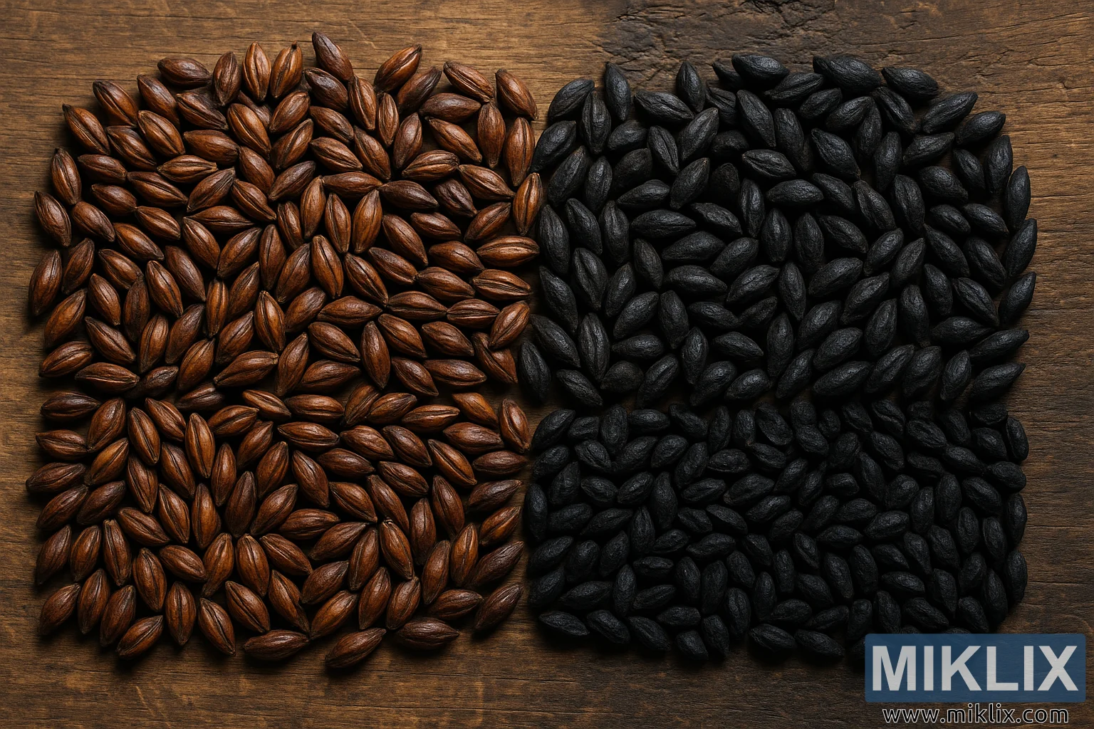 Zwei Sorten dunkel geröstetes Malz, Schokoladen- und Schwarzmalz, angeordnet auf rustikalem Holz, wodurch satte Farben, Texturen und Röstgrade für das Brauen hervorgehoben werden.