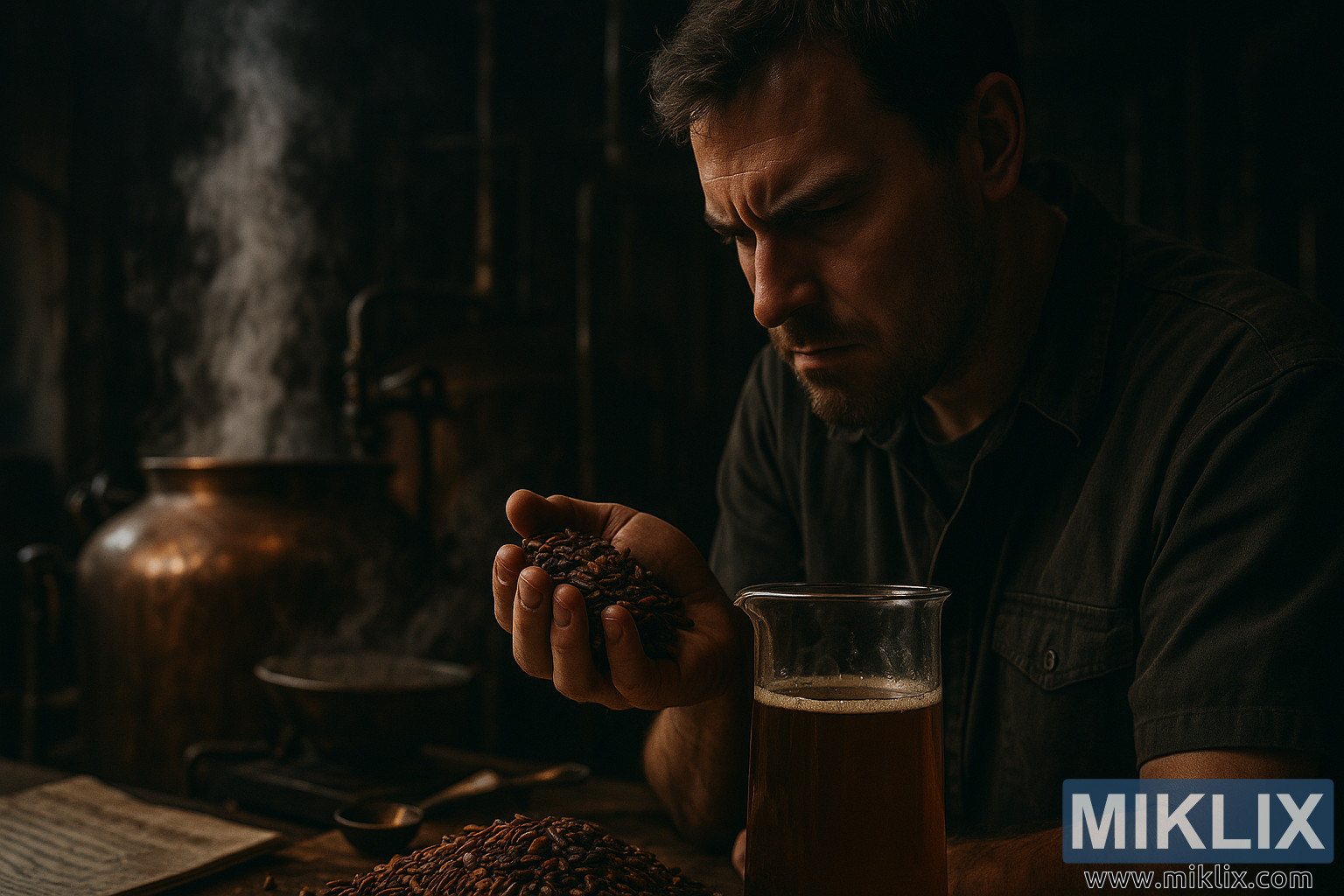 Düstere Brauhausszene mit einem Brauer, der spezielles Röstmalz studiert, einem dampfenden Kessel und Webmaschinen, die an die Herausforderungen bei der Herstellung komplexer Aromen erinnern.
