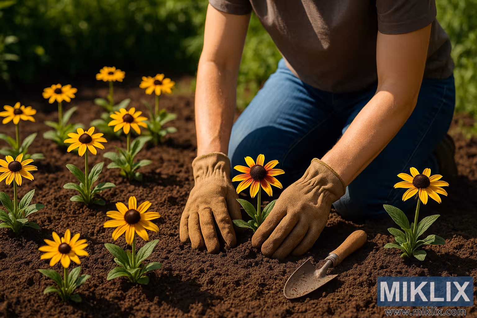 Dieses hochauflösende Foto im Querformat fängt einen friedvollen und sinnlichen Moment sommerlicher Gartenarbeit ein: Ein Gärtner kniet in einem sonnenbeschienenen Beet und pflanzt junge Rudbeckia-Sämlinge (Rudbeckia hirta). Die Szene vermittelt Sorgfalt und handwerkliches Können – ein Bild der Verbundenheit zwischen menschlichen Händen und der lebendigen Erde. Das warme, goldene Sonnenlicht erhellt die Texturen von Erde, Blättern und Blüten und schafft so ein Porträt, das die Freude am Pflegen des Lebens im Garten feiert.