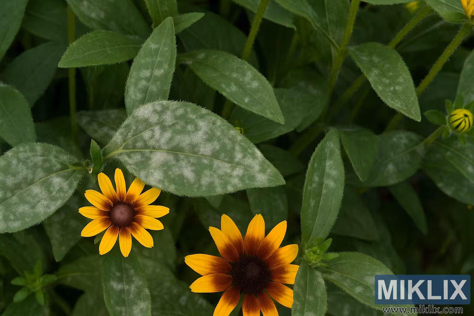 Dieses hochauflösende Foto im Querformat zeigt eine Nahaufnahme des Laubs der Schwarzäugigen Rudbeckie (Rudbeckia hirta) mit den charakteristischen Symptomen von Mehltau, einer häufigen Pilzkrankheit bei Gartenpflanzen. Aufgenommen bei sanftem, natürlichem Licht, vereint das Bild wissenschaftliche Genauigkeit mit ästhetischer Klarheit und verdeutlicht den Kontrast zwischen den gesunden grünen Blättern und dem blassen, pudrigen Belag, der typisch für eine Infektion ist. Die Komposition bietet Kontext und Detailreichtum: Mehrere Blätter füllen das Bild in überlappenden Schichten, wobei der weiße Pilzbefall deutlich auf ihrer Oberfläche sichtbar ist, während die bekannten goldenen Blüten der Schwarzäugigen Rudbeckie am unteren Bildrand hervorlugen und dem Bild einen Farbtupfer und Lebendigkeit verleihen.
