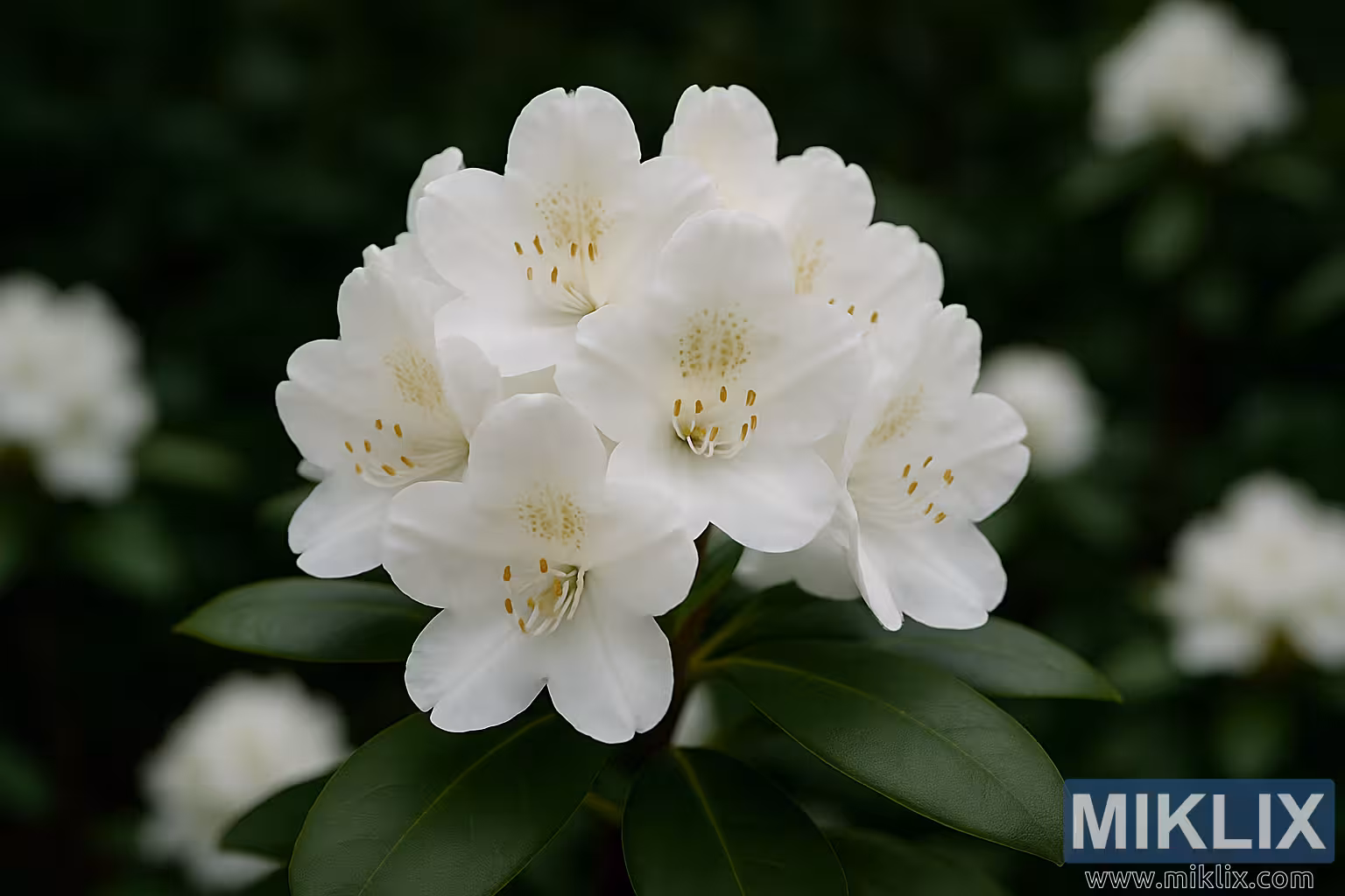 Eine leuchtende Nahaufnahme des Rhododendrons Boule de Neige mit makellos weißen Blüten, goldenen Sprenkeln und dunkelgrünem, glänzendem Laub.