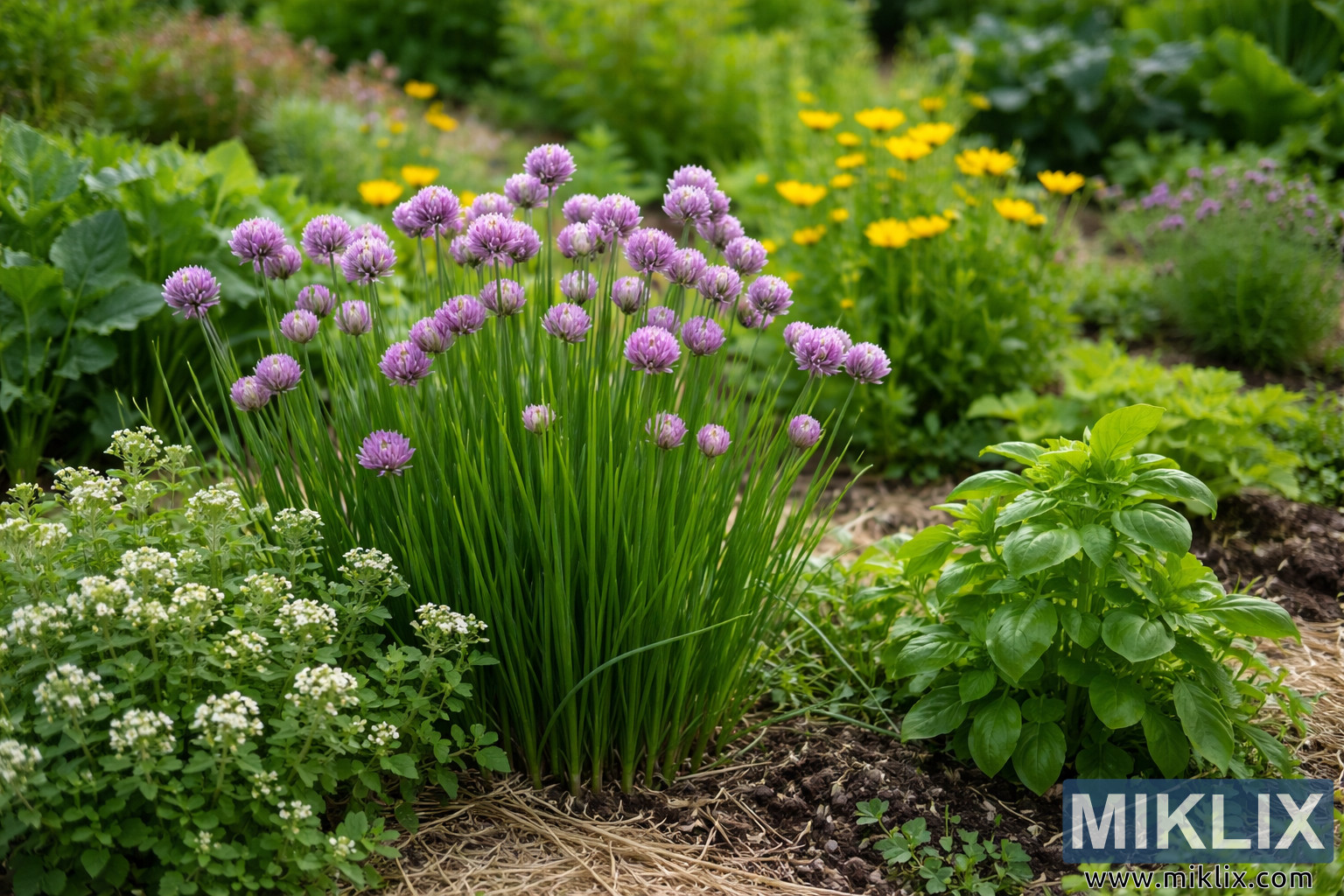 Hochauflösendes Gartenbild, das blühenden Schnittlauch zeigt, der zusammen mit anderen Kräutern und Blumen gepflanzt ist und eine gesunde Mischkultur in einem lebendigen Hausgarten veranschaulicht.
