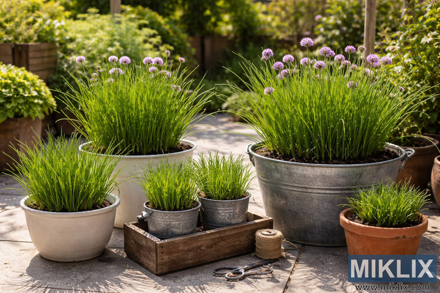 Das Bild zeigt eine helle, hochauflösende Landschaftsfotografie von Schnittlauch, der in verschiedenen Gefäßen auf einer sonnigen Terrasse wächst. Mehrere Pflanzgefäße unterschiedlicher Größe, Form und Material sind in einer entspannten, aber dennoch durchdachten Komposition angeordnet, die den Eindruck ungezwungener Gartenarbeit vermittelt. Der Schnittlauch ist üppig und gesund, mit dichten Büscheln schlanker, aufrechter grüner Blätter, die aus dunkler, gut bewässerter Erde sprießen. Einige der Schnittlauchpflanzen blühen und zeigen kleine, runde, violette Blütenköpfe, die sich zart über das Laub erheben und einen dezenten Farbkontrast zur überwiegend grünen Szenerie bilden. Zu den Gefäßen gehören verzinkte Metallwannen mit sanft verwitterten Oberflächen, glatte weiße Keramiktöpfe, klassische Terrakotta-Pflanzgefäße und kleinere Metalltöpfe, die in einer niedrigen Holzkiste stehen. Jedes Gefäß weist leichte Unterschiede in Textur und Farbton auf, die zu einer optisch reichen und realistischen Szenerie beitragen. Die Terrassenfläche unter den Gefäßen scheint aus Stein- oder Betonplatten zu bestehen, die leicht gesprenkelt und von der direkten Sonneneinstrahlung erwärmt sind. Sanfte, natürliche Schatten fallen auf den Boden und die Pflanzgefäße und deuten auf das Licht des späten Vormittags oder frühen Nachmittags hin. Im Vordergrund sind Gartengeräte und -utensilien ordentlich platziert, darunter eine Metallschere mit Schlaufengriffen und eine Spule Naturgarn, was das Thema des aktiven Gärtnerns unterstreicht. Der Hintergrund ist leicht verschwommen und gibt den Blick auf Hochbeete und üppige Pflanzen frei, die die Szene einrahmen, ohne von den Schnittlauchpflanzen abzulenken. Insgesamt vermittelt das Bild Frische, Wachstum und eine friedliche, häusliche Atmosphäre und betont die Einfachheit und die Freude am Anbau von Kräutern in Töpfen auf der Terrasse.
