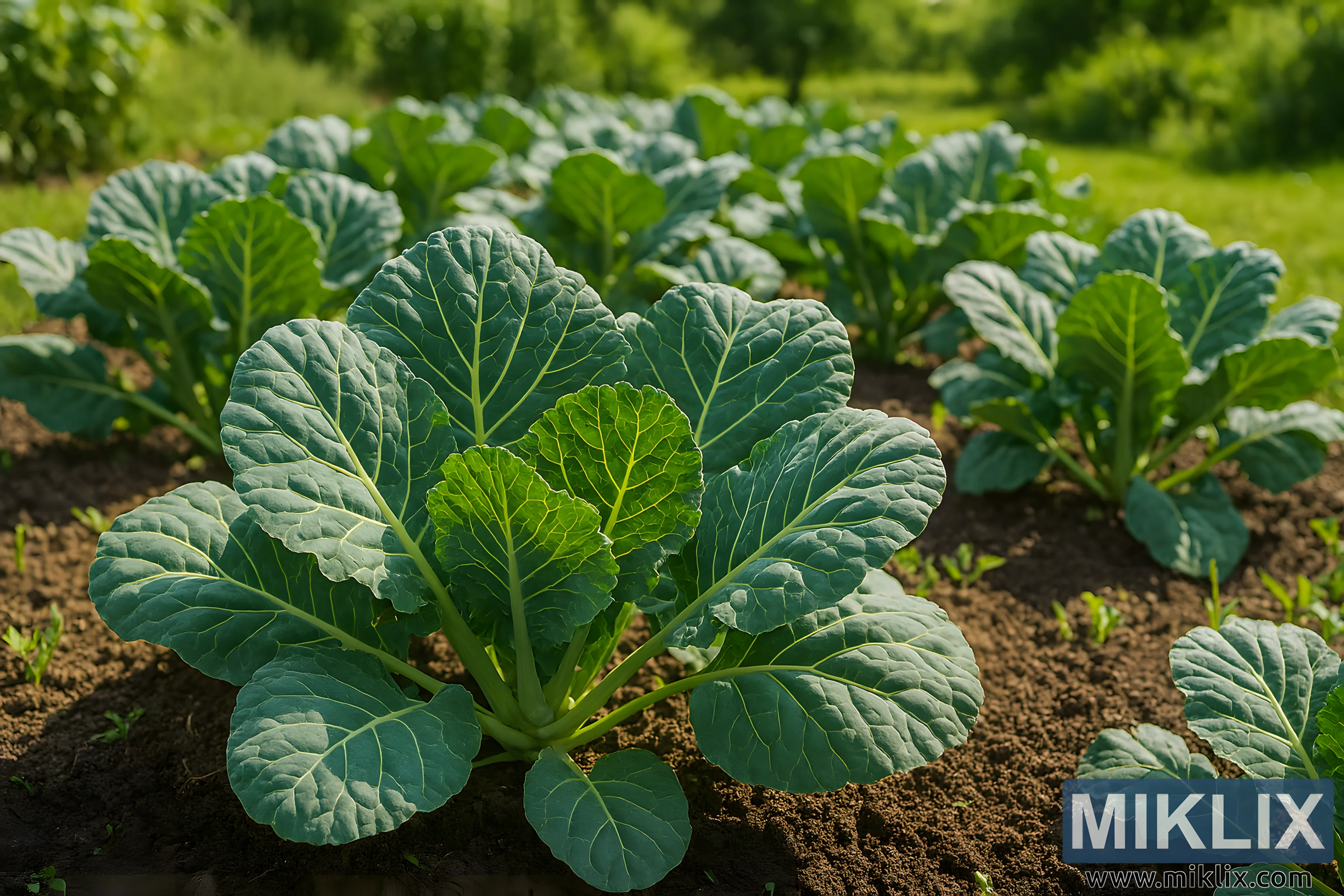 Die Beleuchtung ist natürlich und hell, typisch für einen klaren Sommertag. Die Sonne wirft ein warmes Licht, das die Leuchtkraft der Grün- und Brauntöne verstärkt. Die Komposition ist ausgewogen: Das zentrale Kohlblatt bildet den Blickfang, während die dahinterliegenden Reihen den Blick des Betrachters tiefer in die Szene lenken. Das Bild vermittelt ein Gefühl von Fülle, Sorgfalt und saisonaler Vitalität und eignet sich daher ideal für Bildungs-, Landwirtschafts- oder kulinarische Kontexte, in denen botanische Genauigkeit und visuelle Attraktivität von entscheidender Bedeutung sind.