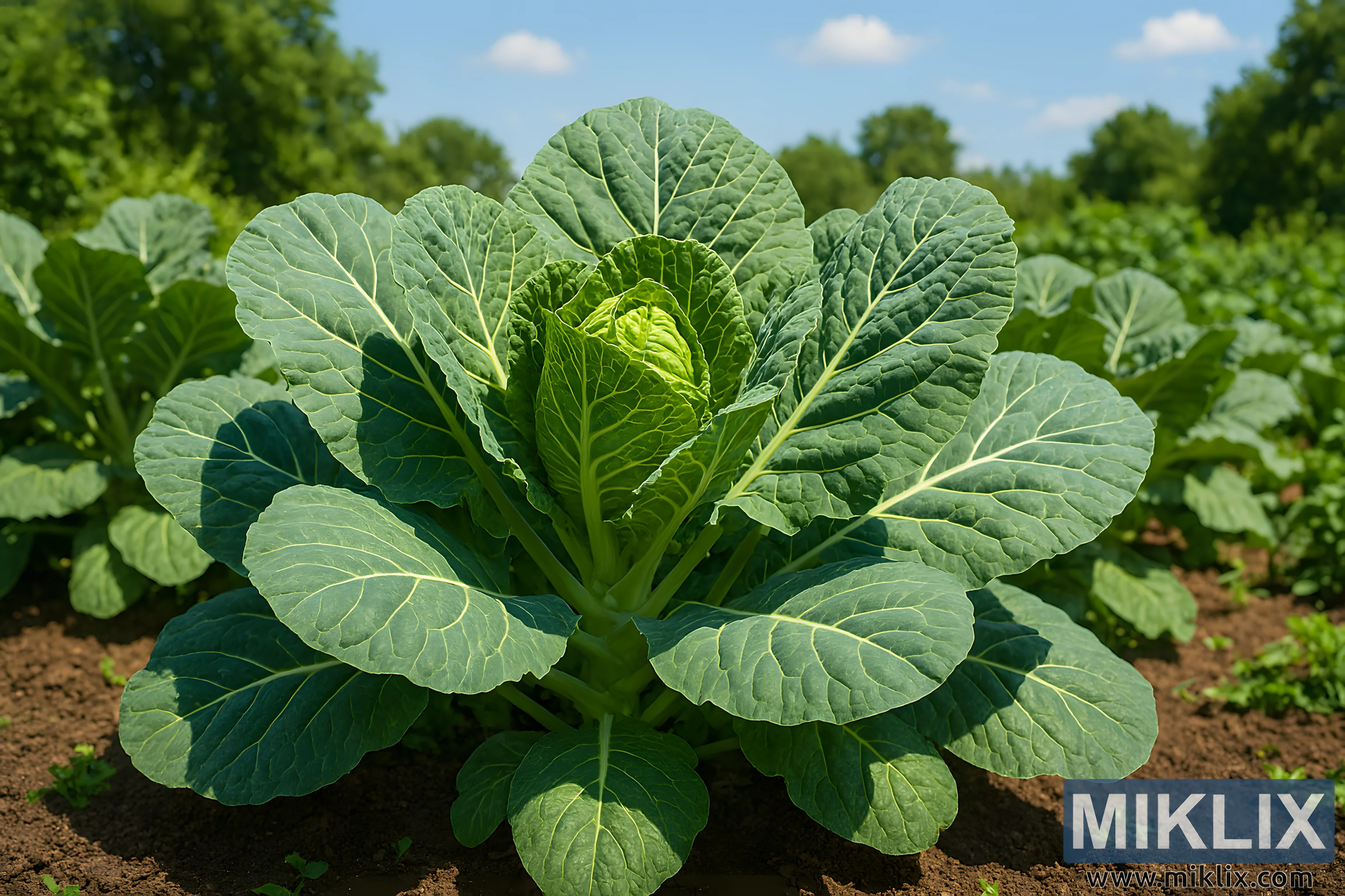 Dieses Bild veranschaulicht die Gesundheit und Wuchskraft des Morris Heading-Kohls, einer beliebten, traditionellen Sorte, die für ihre kompakten Köpfe und aromatischen Blätter bekannt ist. Es ist ein visuelles Beispiel für nachhaltiges Gärtnern, saisonale Fülle und die Schönheit von Blattgemüse, das unter idealen Bedingungen prächtig gedeiht.