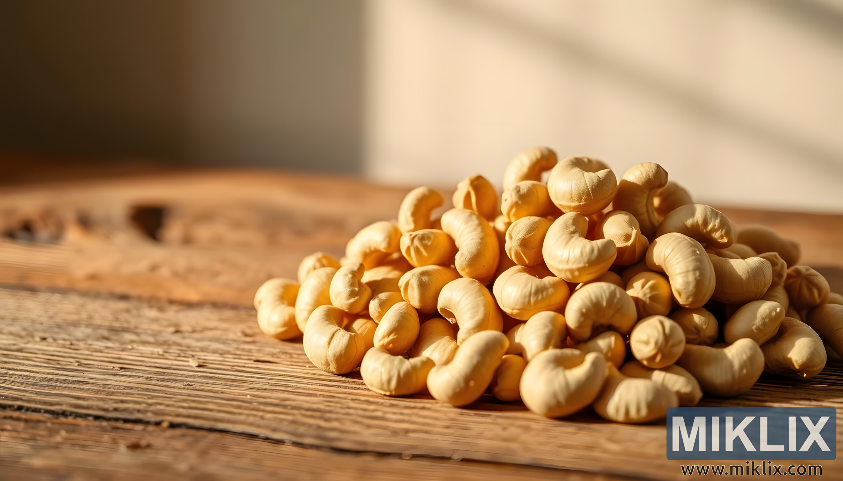 Das Bild zeigt ein auffallend einfaches und doch zutiefst eindrucksvolles Stillleben: Ein Haufen frischer Cashewnüsse, aufgehäuft auf einer rustikalen Holzoberfläche, getaucht in sanftes, goldenes Licht, das von der Seite einfällt. Das Licht ist warm und natürlich, fängt die glatten, hellen Oberflächen der Cashewnüsse ein und hebt ihre charakteristischen Rundungen hervor. Die Schatten auf dem Tisch verstärken die taktilen Eigenschaften der Nüsse und lassen ihre Oberfläche fast samtig erscheinen. Dieses Spiel aus Licht und Schatten ist nicht hart, sondern sanft und stimmungsvoll und erinnert an ein Leuchten des späten Nachmittags oder frühen Morgens, das die gesunde und organische Natur des Motivs unterstreicht. Die Holzoberfläche selbst trägt zu dieser Atmosphäre bei; ihre sichtbare Maserung, kleinen Unvollkommenheiten und warmen Töne bilden einen perfekten Kontrast zu den cremigen Beigetönen der Cashewnüsse und verleihen dem Bild eine erdige, authentische Atmosphäre.