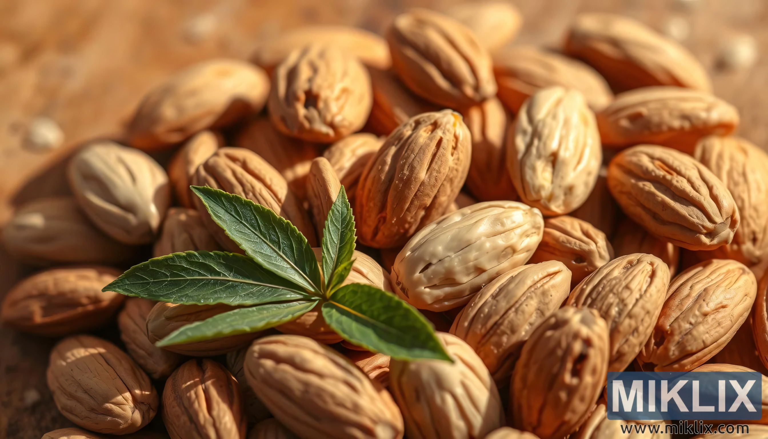 Inmitten dieser Fülle thront anmutig ein einzelnes grünes Mandelblatt auf der Traube, dessen leuchtender Farbton einen markanten Kontrapunkt zur ansonsten warmen Farbpalette bildet. Das Blatt sorgt nicht nur für einen erfrischenden Farbtupfer, sondern verankert die Komposition auch subtil in ihrem botanischen Kontext und erinnert den Betrachter an die landwirtschaftlichen und natürlichen Wurzeln des Mandelbaums. Seine Adern fangen das Licht in zarten Details ein, und seine Platzierung wirkt gewollt, als wolle uns die Natur selbst an die lebendigen Ursprünge der Pflanze erinnern, während wir die von ihr hervorgebrachte Ernte bewundern. Diese Gegenüberstellung von lebendigem Grün und geernteter Nuss spiegelt eine tiefere Erzählung von Kreislauf und Erneuerung wider und unterstreicht die Rolle der Mandeln als Brücke zwischen Erde und Nahrung.