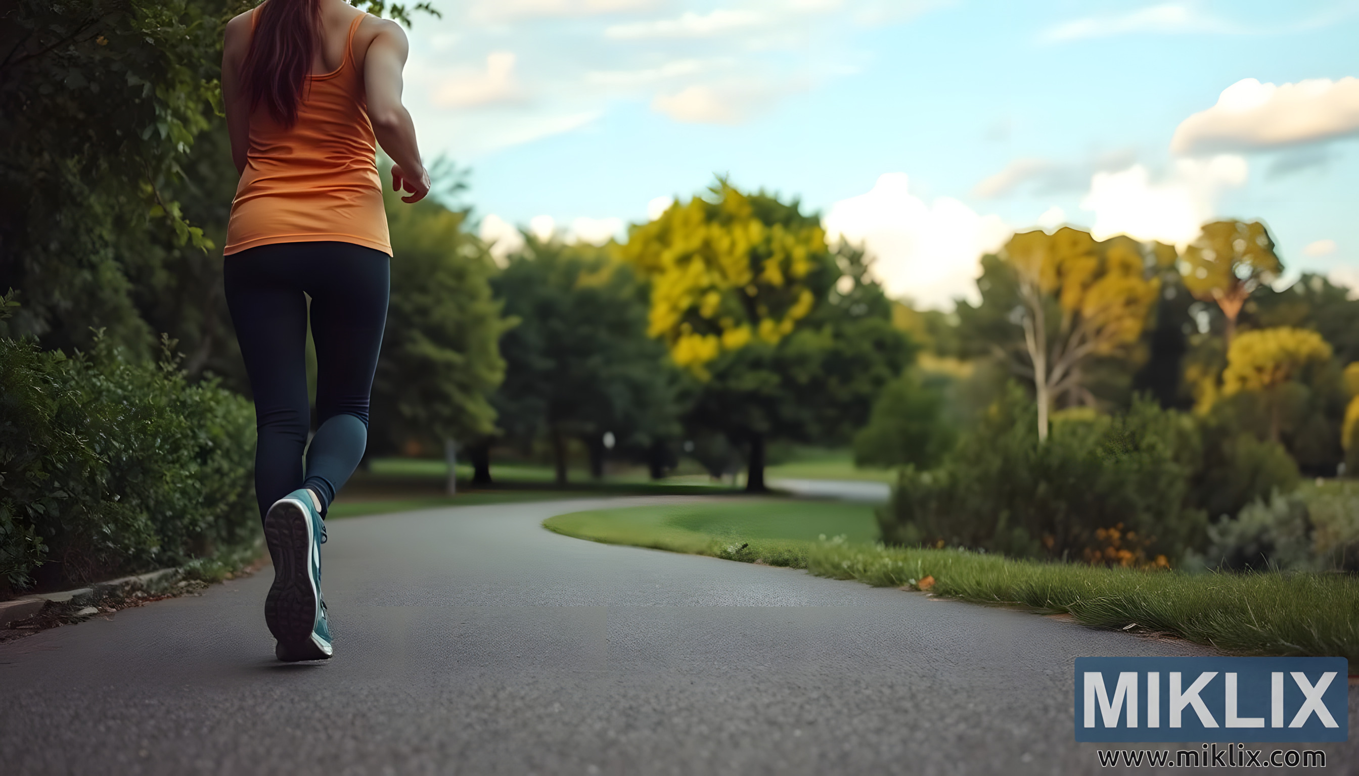 Das Bild fängt die ruhige Entschlossenheit und den erholsamen Rhythmus eines flotten Spaziergangs inmitten der Natur ein. Ganz vorn schreitet eine Person zielstrebig einen glatt gepflasterten, gewundenen Parkweg entlang. Ihr orangefarbenes Oberteil und die engen, dunklen Sportleggings bilden einen lebhaften Kontrast zum sanften Grün der umgebenden Landschaft. Ihre auf Komfort und Ausdauer ausgelegten Turnschuhe berühren den Boden mit Präzision, und ihr Gang strahlt Selbstvertrauen und Entschlossenheit aus und verkörpert nicht nur körperliche Aktivität, sondern auch die Disziplin und Ausgeglichenheit, die entstehen, wenn man der Gesundheit Priorität einräumt. An der Art, wie ihre Arme sanft neben ihnen schwingen und ihre leicht nach vorne geneigte Haltung spürt man sowohl Energie als auch Ruhe, eine natürliche Synergie aus Anstrengung und Entspannung. Dies ist die Art von Spaziergang, die mehr ist als Bewegung – es ist Meditation in Bewegung, eine Übung für Körper und Geist gleichermaßen.