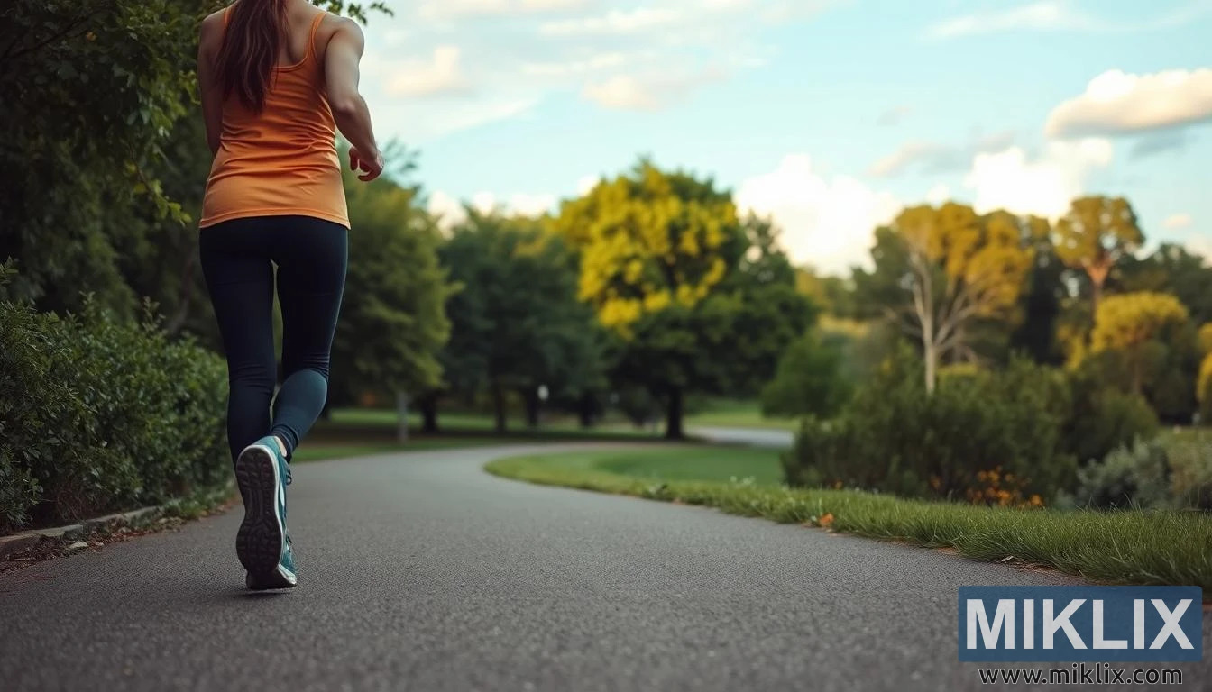 Parkszene mit einer Person, die zügig auf einem gewundenen Pfad geht, umgeben von üppigem Grün und offenem Himmel, als Symbol für Wellness und Vorteile bei der Gewichtskontrolle.
