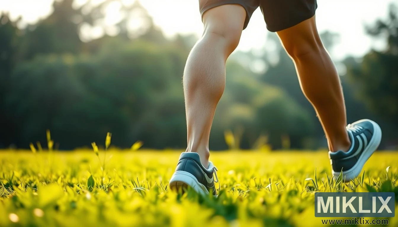 Das Bild fängt einen beeindruckend dynamischen Moment ein: die Nahaufnahme einer Person, die über ein sonnenbeschienenes Feld geht. Die Kamera ist tief eingestellt, um die rhythmische Kraft ihres Schrittes hervorzuheben. Der Fokus liegt bewusst auf dem Unterkörper – Beine und Füße in eleganten Sportschuhen – und betont die Muskeldefinition und die subtile Spannung der Waden, die sich bei jedem Schritt anspannen und wieder entspannen. Diese Perspektive betont nicht nur die physische Mechanik des Gehens, sondern vermittelt auch eine tiefere Geschichte über Ausdauer, Gesundheit und die stille Entschlossenheit, die einer so einfachen Handlung innewohnt. Jeder Schritt scheint Kraft und Zielstrebigkeit zu vermitteln und unterstreicht, dass Gehen sowohl eine leicht zugängliche Übung als auch eine wichtige Praxis für langfristiges Wohlbefinden ist.