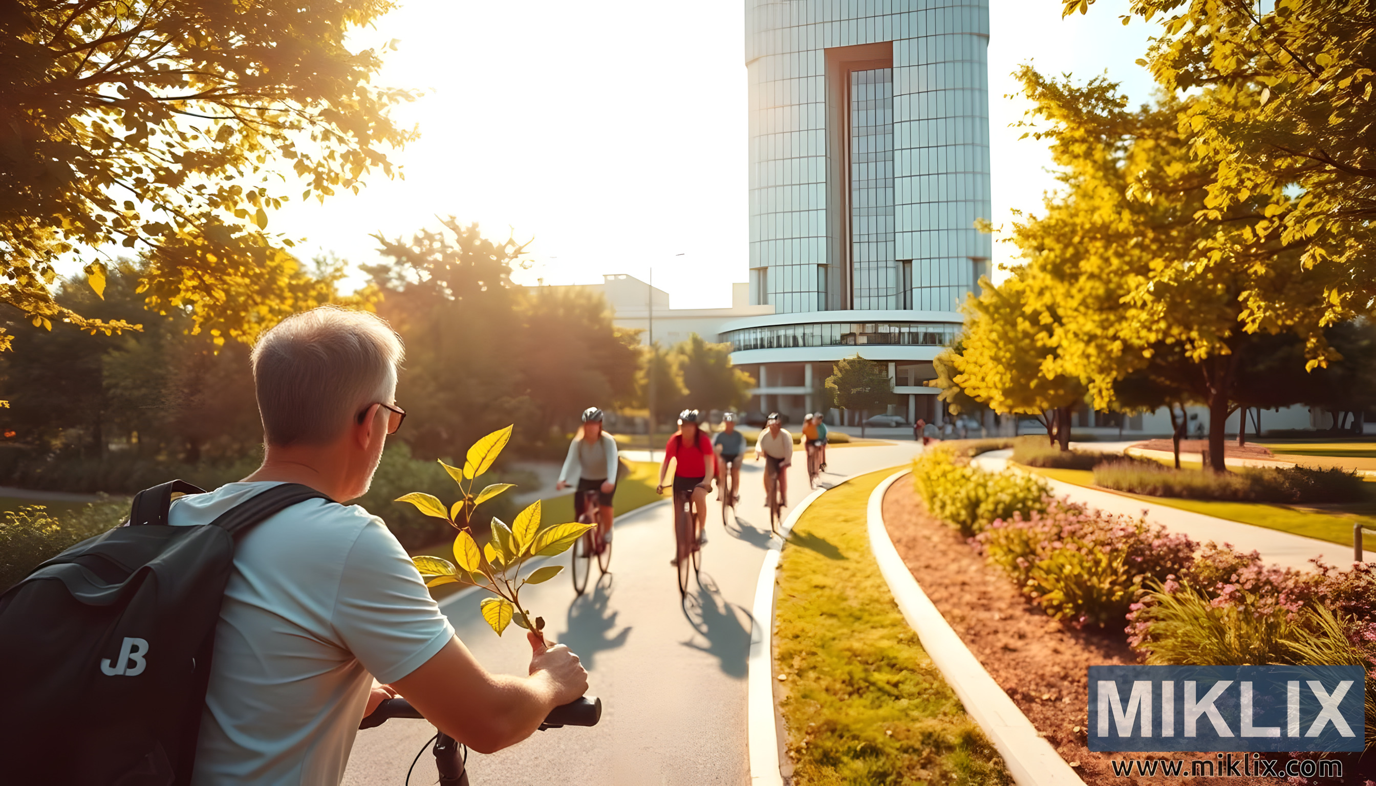 Insgesamt erzählt das Bild eine Geschichte der Verbundenheit. Der Mann mit dem belaubten Zweig symbolisiert achtsame Reflexion; die Radfahrer im Mittelgrund verkörpern Gemeinschaft und Vitalität; und das glänzende Gebäude in der Ferne steht für Wissenschaft, Fortschritt und die Infrastruktur der Fürsorge. Vereint durch den sanften goldenen Schein der untergehenden Sonne bilden diese Elemente eine Erzählung, die vom tiefgreifenden Potenzial urbaner Räume spricht, sowohl individuelles Wohlbefinden als auch kollektiven Fortschritt zu fördern. Sie bietet nicht nur einen flüchtigen Blick auf einen Moment, sondern auch eine ehrgeizige Vision für die Städte von morgen.