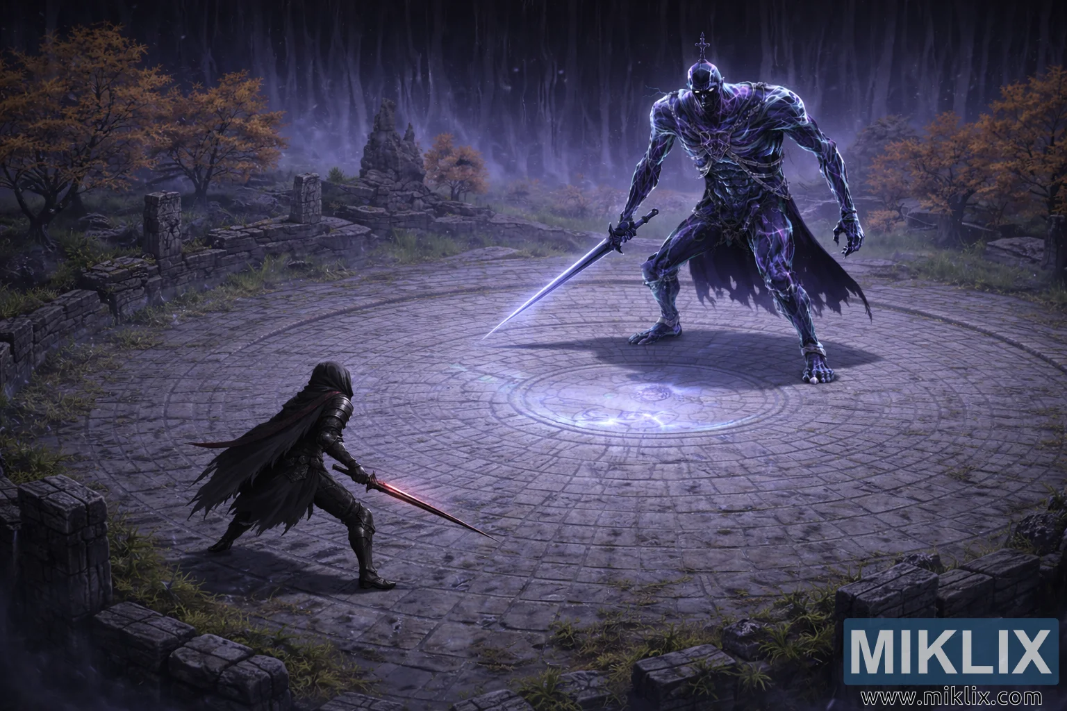 Die weitere Umgebung ist in dieser Gesamtansicht detailreich dargestellt. Die kreisrunde Arena ist von niedrigen, zerbrochenen Steinmauern und verstreuten Ruinen umgeben, durch deren Ritzen Grasbüschel und Kletterpflanzen sprießen. Jenseits des Rings öffnet sich die Landschaft des Evergaols zu nebligen Ruinen und unebenem Gelände, durchsetzt mit herbstlichen Bäumen, deren sanft goldene Blätter einen leichten Kontrast zu den vorherrschenden Purpur- und Blautönen der Atmosphäre bilden. Im fernen Hintergrund senken sich hohe Vorhänge aus Dunkelheit und schimmerndem Licht wie vertikale Schleier herab und deuten auf die magische Barriere hin, die das Evergaol umschließt und das Duell von der Außenwelt abgrenzt. Schwebende Partikel treiben durch die Luft und verstärken das Gefühl geheimnisvoller Stille und unheimlicher Atmosphäre.