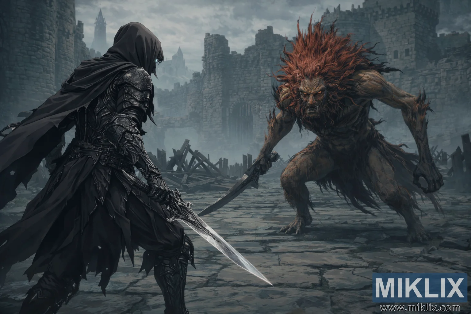 Eine Fantasy-Illustration im Anime-Stil zeigt eine angespannte Konfrontation zweier furchterregender Gestalten im zerstörten Hof von Schloss Morne, kurz vor Beginn einer erbitterten Schlacht. Im Vordergrund links steht der Befleckte, gehüllt in eine elegante Rüstung des Schwarzen Messers, die das schwache Umgebungslicht mit einem metallischen, anthrazitfarbenen Schimmer reflektiert. Die Rüstung ist detailreich verziert mit übereinanderliegenden Platten, gravierten Linien und dezenten Zierleisten, die Eleganz und Tödlichkeit zugleich andeuten. Ein dunkler, kapuzenartiger Umhang liegt über den Schultern des Befleckten, dessen Stoff leicht im kalten Wind weht und so Bewegung und Geheimnisvolles vermittelt. Das Gesicht des Charakters ist größtenteils von der Kapuze verdeckt, nur ein schwacher Schimmer entschlossener Augen ist unter dem Schatten zu erkennen. In einer Hand hält der Befleckte einen schlanken Dolch, dessen Klinge einen blassen Lichtreflex einfängt und Bereitschaft ohne offene Aggression signalisiert.