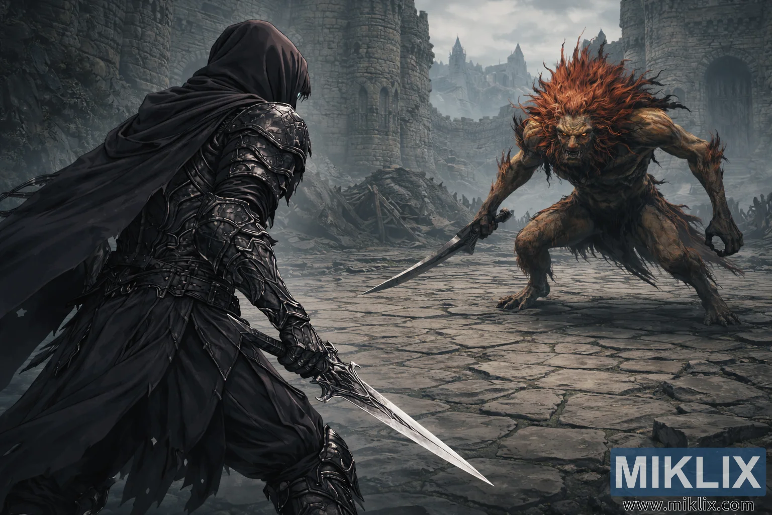 Rechts im Bild ragt der Leonine Misbegotten empor, ein gewaltiger, bestienartiger Krieger, dessen imposante Erscheinung einen starken Kontrast zur schlanken Gestalt des Befleckten bildet. Sein muskulöser, sehniger Körper ist von rauer, erdfarbener Haut bedeckt, die von Narben und schroffen Strukturen gezeichnet ist. Das auffälligste Merkmal der Kreatur ist ihre wilde, feurige Mähne aus rotem und orangefarbenem Haar, die in chaotischen Strähnen vom Wind bewegt wird und mit scharfen Anime-Zeichnungen dargestellt ist, die Wildheit und ungebändigte Energie vermitteln. Seine glühenden Augen fixieren den Befleckten mit roher Feindseligkeit, und seine gebückte Haltung deutet sowohl auf Bereitschaft als auch auf animalische Aggression hin. Eine Klauenhand umklammert ein massives, verwittertes Schwert, dessen abgebrochene Klinge und abgenutztes Metall von unzähligen vorangegangenen Schlachten zeugen. Die andere Hand ist leicht ausgestreckt, die Finger gekrümmt, als würde sie die Distanz abschätzen, bevor sie nach vorne stürmt.