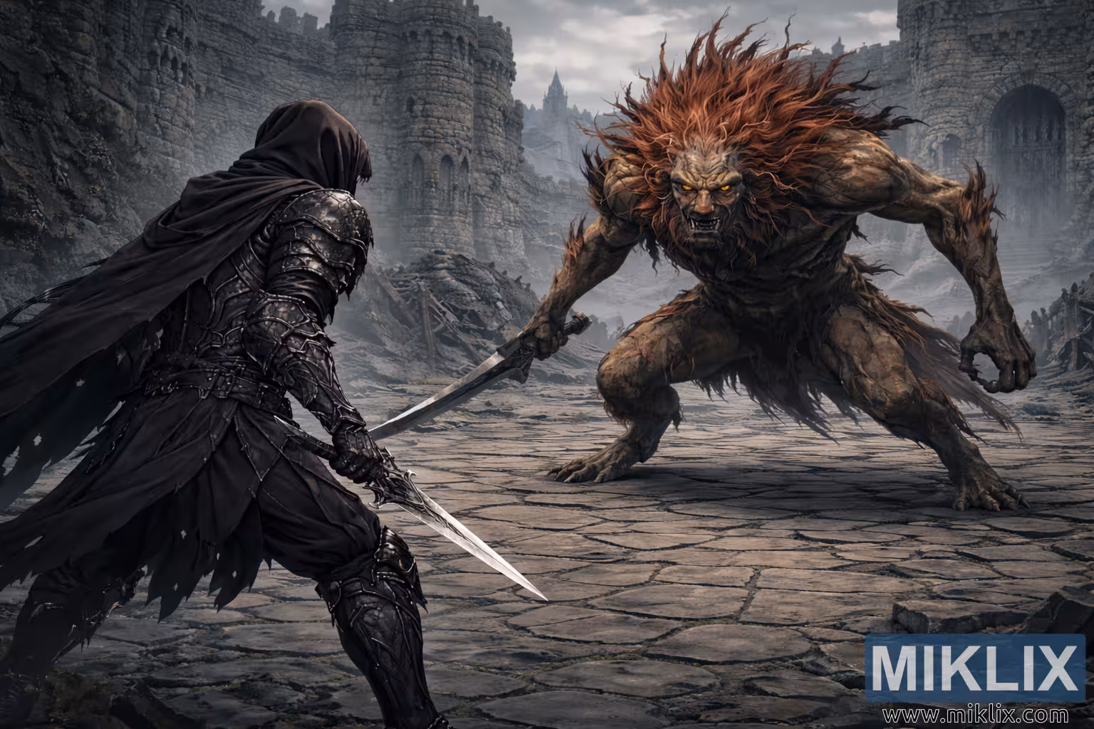 Die Komposition erzeugt Spannung durch räumliche Balance und visuelle Kontraste. Obwohl der Endgegner größer und näher ist, bewahrt die zurückgezogene Kamera ein filmisches Gefühl von Größe und lässt die zerstörte Festung die Konfrontation einrahmen. Diagonale Linien in den gesprungenen Steinen und verstreuten Trümmern lenken den Blick des Betrachters subtil zwischen den beiden Kontrahenten hin und her. Der Anime-Stil schärft die Kanten der Rüstungen, übertreibt die Bewegung der Haare und glättet die Übergänge in Nebel und Himmel, was zu einer polierten, filmischen Ästhetik führt. Die gesamte Szene scheint in einem fragilen Moment der Stille zu schweben und fängt die atemlose Pause ein, bevor Stahl auf Klaue trifft. Sie vermittelt die epische Größe düsterer Fantasy inmitten einer detailreichen mittelalterlichen Ruine.