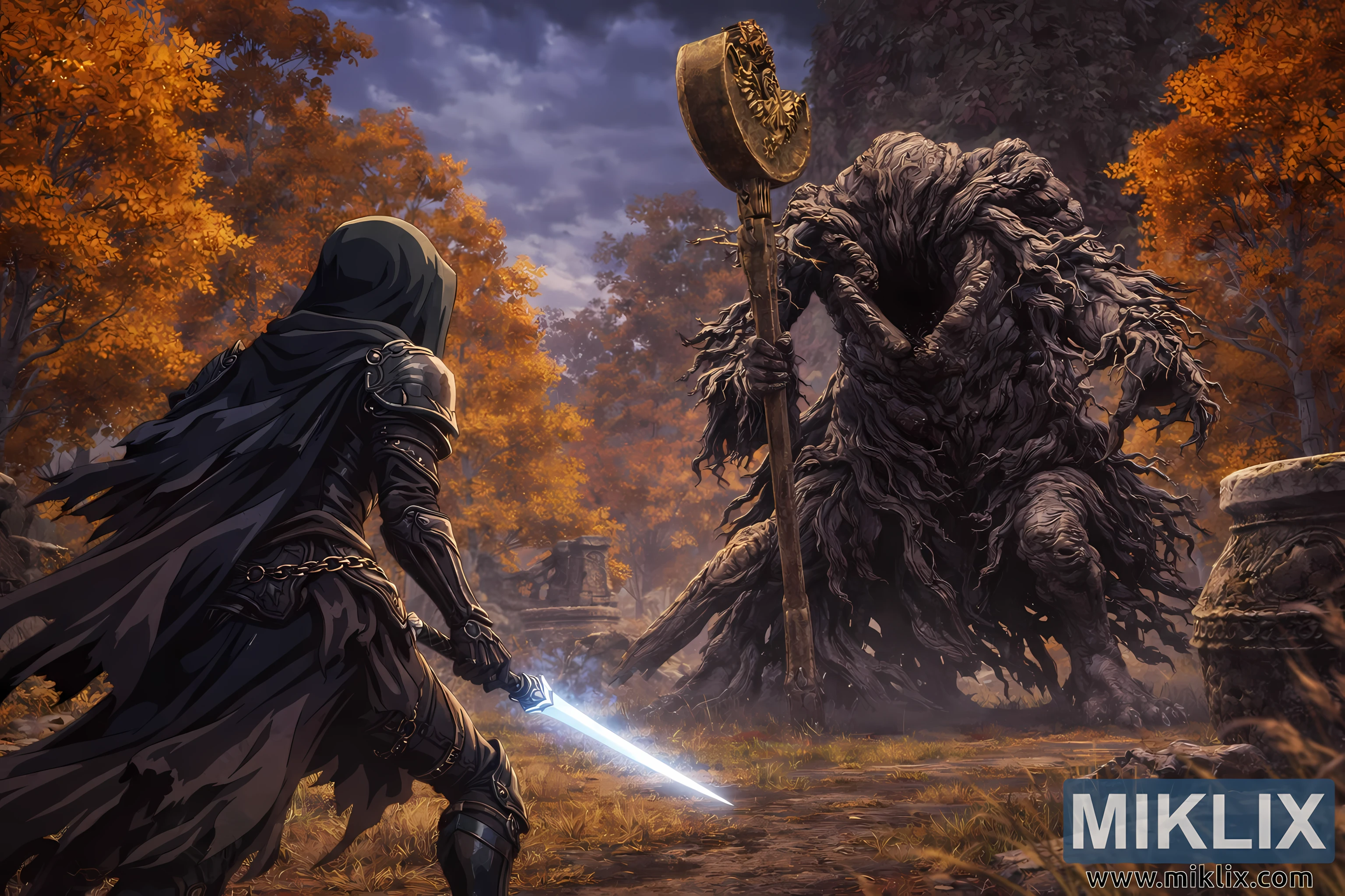 Dieses detailreiche Fan-Art-Werk fängt einen Höhepunkt aus Elden Ring ein, angesiedelt in der geheimnisvoll schönen südwestlichen Region Liurnia der Seen. Die Szene spielt in einem dichten, herbstlichen Wald, der in feurige Orange- und Goldtöne getaucht ist und dessen Blätterdach in einem ätherischen Licht erstrahlt. Antike Steinruinen, teilweise von der Natur zurückerobert, erheben sich im Hintergrund – stumme Zeugen des bevorstehenden Zusammenstoßes zweier gewaltiger Mächte.