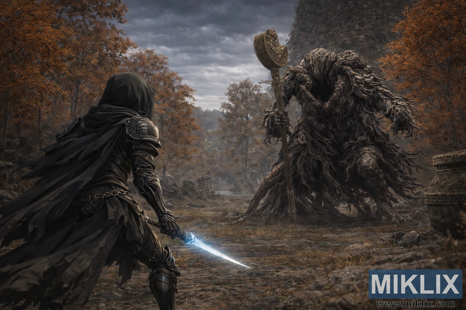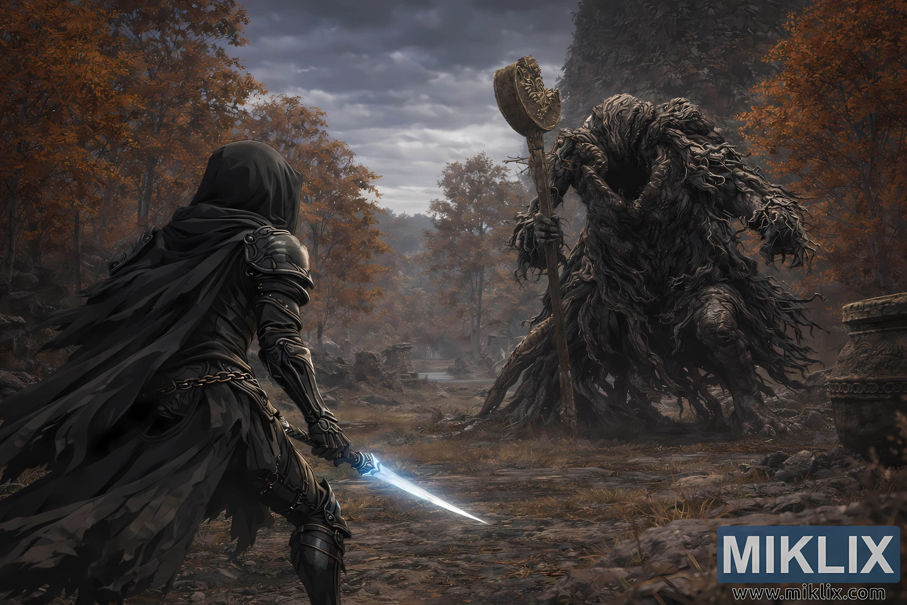 Dieses eindrucksvolle Fan-Art-Werk zu Elden Ring zeigt eine spannungsgeladene und atmosphärische Konfrontation im Südwesten von Liurnia der Seen. Die Szene fängt den Moment kurz vor dem Kampf zwischen einem Spielercharakter in der bedrohlichen Rüstung des Schwarzen Messers und dem turmhohen, grotesken Erdbaum-Avatar ein. Schauplatz ist eine Waldlichtung, die in die warmen Farben des Herbstes getaucht ist. Bernstein- und rostfarbene Blätter hängen an den knorrigen Ästen und bedecken den felsigen Boden. Der Himmel ist bedeckt und wirft ein diffuses, düsteres Licht, das die Vorahnung verstärkt.