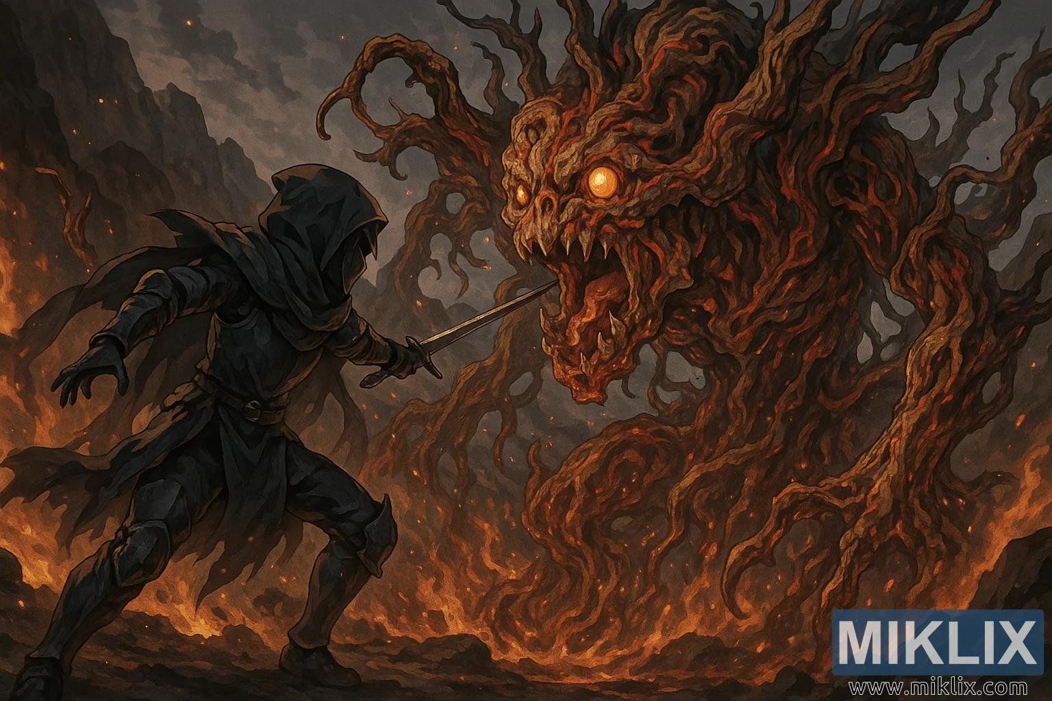 Die Komposition betont Bewegung und Konfrontation: Der Vorwärtsdrang des Befleckten trifft auf die stürmische Haltung des Baumgeistes, dessen Ranken sich in chaotischen Bögen spiralförmig nach außen winden und die Szene einrahmen. Die Beleuchtung ist intensiv und gerichtet und wirft lange Schatten, während sie die scharfen Kanten der Rüstung und die glühenden Konturen der Kreatur erhellt. Jedes Detail – von den Funken in der Luft bis zur flackernden Hitze – ist so gestaltet, dass es eine von Feuer und Verfall verzehrte Welt vermittelt und die beunruhigende Schönheit und Gewalt der furchterregendsten Begegnungen in Elden Ring perfekt einfängt.