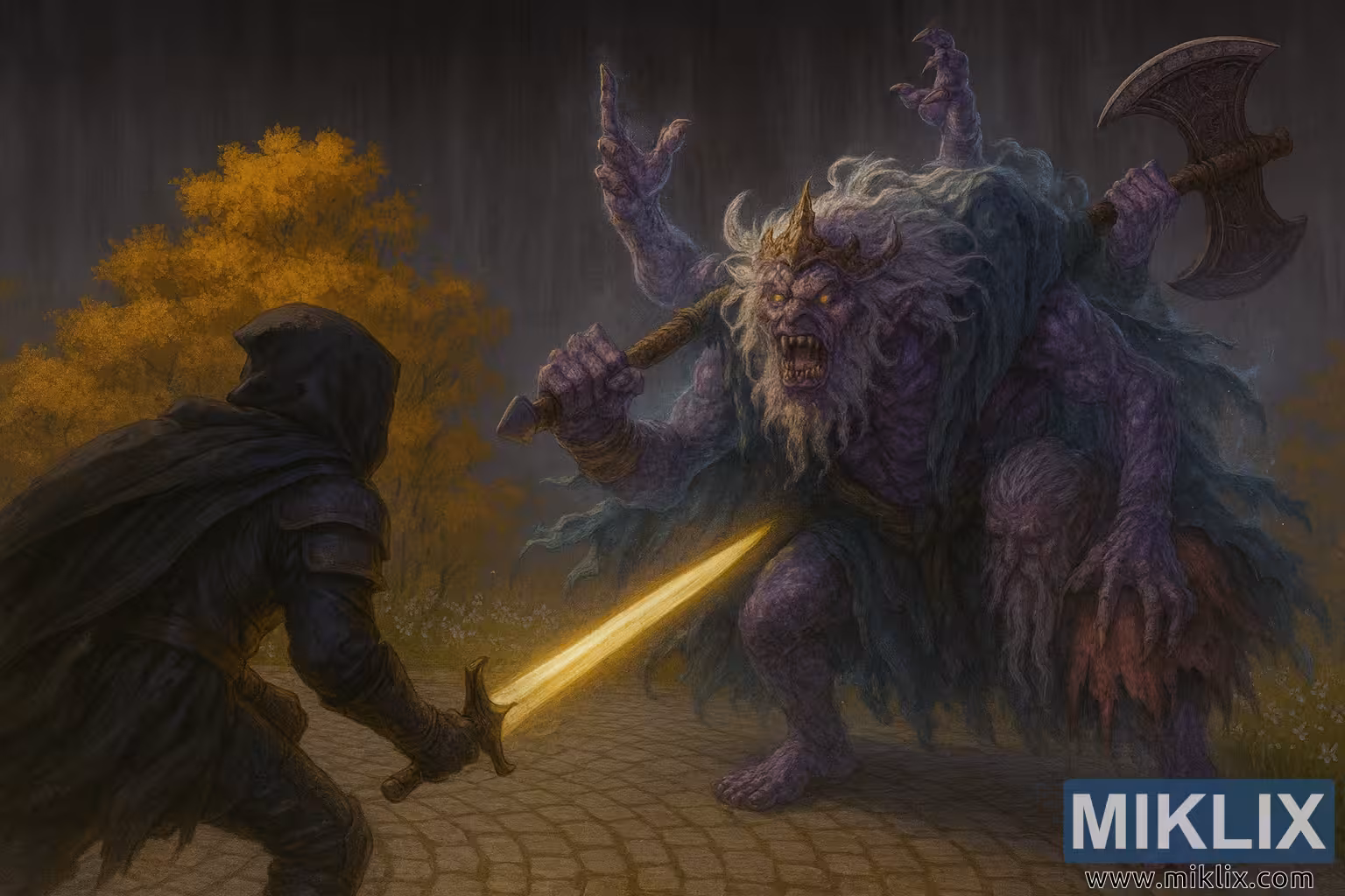 Die Komposition ist filmisch und ausgewogen, die Charaktere stehen sich diagonal auf der Plattform gegenüber. Das leuchtende Schwert und das goldene Laub bilden einen starken Kontrast zur geisterhaften Transparenz von Godefroy und dem stürmischen Himmel. Magische Energie umweht die Kämpfer subtil, und das radiale Pflastermuster lenkt den Blick des Betrachters zum Zentrum des Kampfes. Das Bild liefert eine lebendige und fesselnde Darstellung dieser ikonischen Begegnung aus Elden Ring und vereint Horror, Fantasy und Realismus zu einer detailreichen visuellen Erzählung.