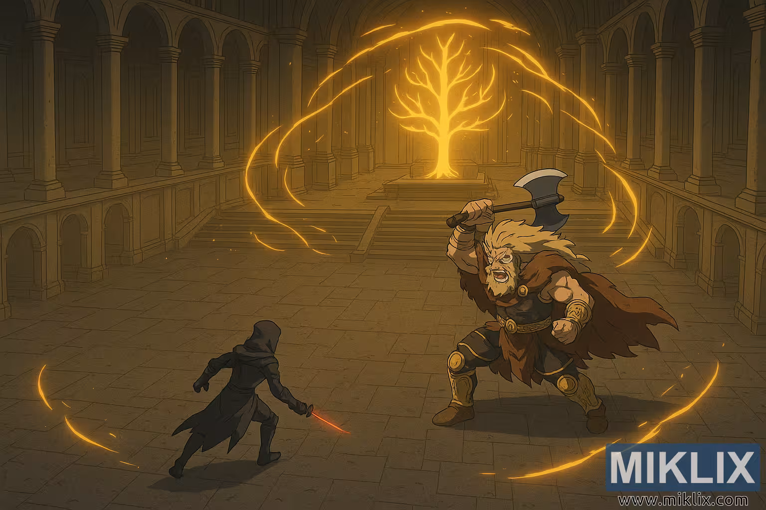 Der erhöhte Aussichtspunkt offenbart die tiefe Stille rund um das Duell – die leere Halle, die schattenhaften Bereiche zwischen den Säulen, die gewaltige Höhe. Diese Leere verstärkt den mythischen Charakter der Konfrontation und lässt die beiden Kämpfer wie winzige, aber monumentale Gestalten erscheinen, die ein Schicksal vollziehen, das seit jeher in die Steine unter ihnen geschrieben steht. Die goldenen Energiebögen, die das Schlachtfeld umkreisen, lenken den Blick des Betrachters und rahmen den Konflikt in dem riesigen Raum ein.