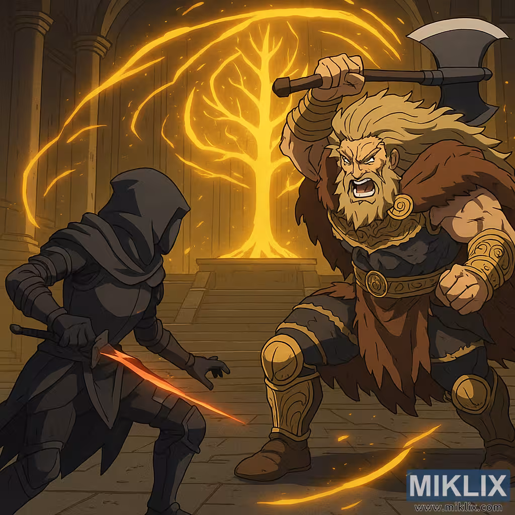 Rechts von ihnen steht Godfrey, der Erste Eldenlord, in seiner Hoarah-Loux-Gestalt – hochgewachsen, muskulös und von wilder Dominanz erfüllt. Seine Pose ist dynamisch und aggressiv: Ein Fuß ist nach vorn gestreckt, sein Oberkörper dreht sich in wilder Entschlossenheit, während er seine gewaltige Zweihandaxt über den Kopf hebt. Sein Gesichtsausdruck zeugt von urtümlicher Wut, sein Mund ist zu einem donnernden Gebrüll aufgerissen, seine Augen glühen vor Kriegerentschlossenheit. Sein langes, goldenes Haar und sein Bart peitschen in der Bewegung und fangen das Licht der umgebenden goldenen Aura ein. Godfreys Rüstung ist mit kunstvollen Schnitzereien und schwerem Fell verziert und vermittelt sowohl königliches Erbe als auch rohe, barbarische Stärke. Trotz seiner Größe verleiht ihm der Animationsstil fließende Bewegungen, wobei Bewegungslinien und wirbelnde Glut die Ahnung des bevorstehenden Aufpralls verstärken.