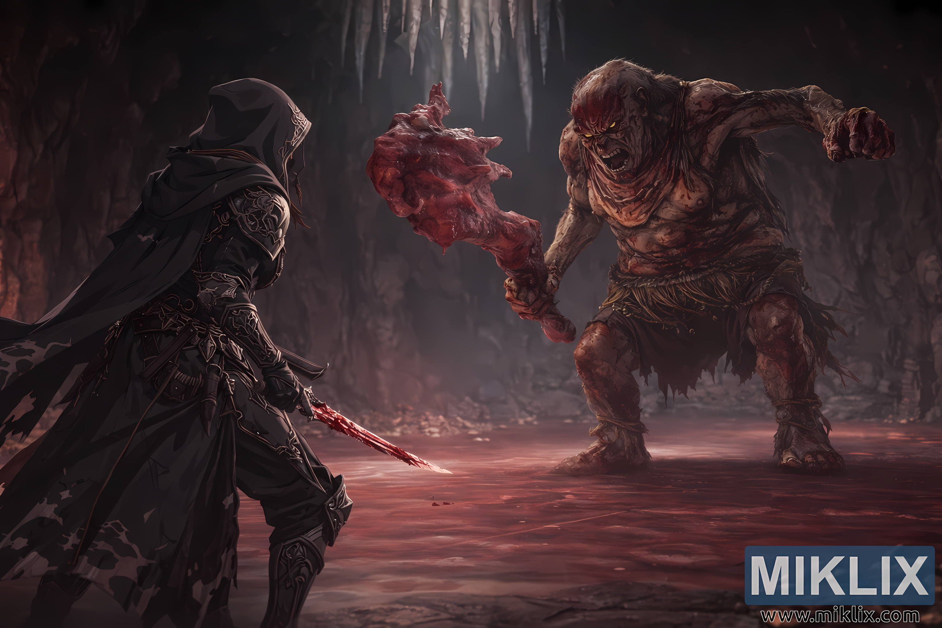 Die Spannung zwischen ihnen ist greifbar. Keiner von beiden hat den ersten Schlag ausgeführt, doch alles deutet auf den unausweichlichen Kampf hin. Wellen breiten sich auf dem rot gefärbten Wasser aus, wo der schwere Fuß des Blutdämons eben noch einen Schritt getan hat, während Tropfen von der Decke fallen und leise in der Höhle widerhallen. Das Licht umgibt die beiden Gestalten mit einem subtilen Heiligenschein, hebt sie von den dunklen Felswänden im Hintergrund ab und lenkt den Blick des Betrachters auf den bevorstehenden Zusammenstoß. Die Szene wirkt wie ein eingefrorener Herzschlag – ein einziger Atemzug, bevor Stahl auf Fleisch trifft und die Höhle im Chaos versinkt.