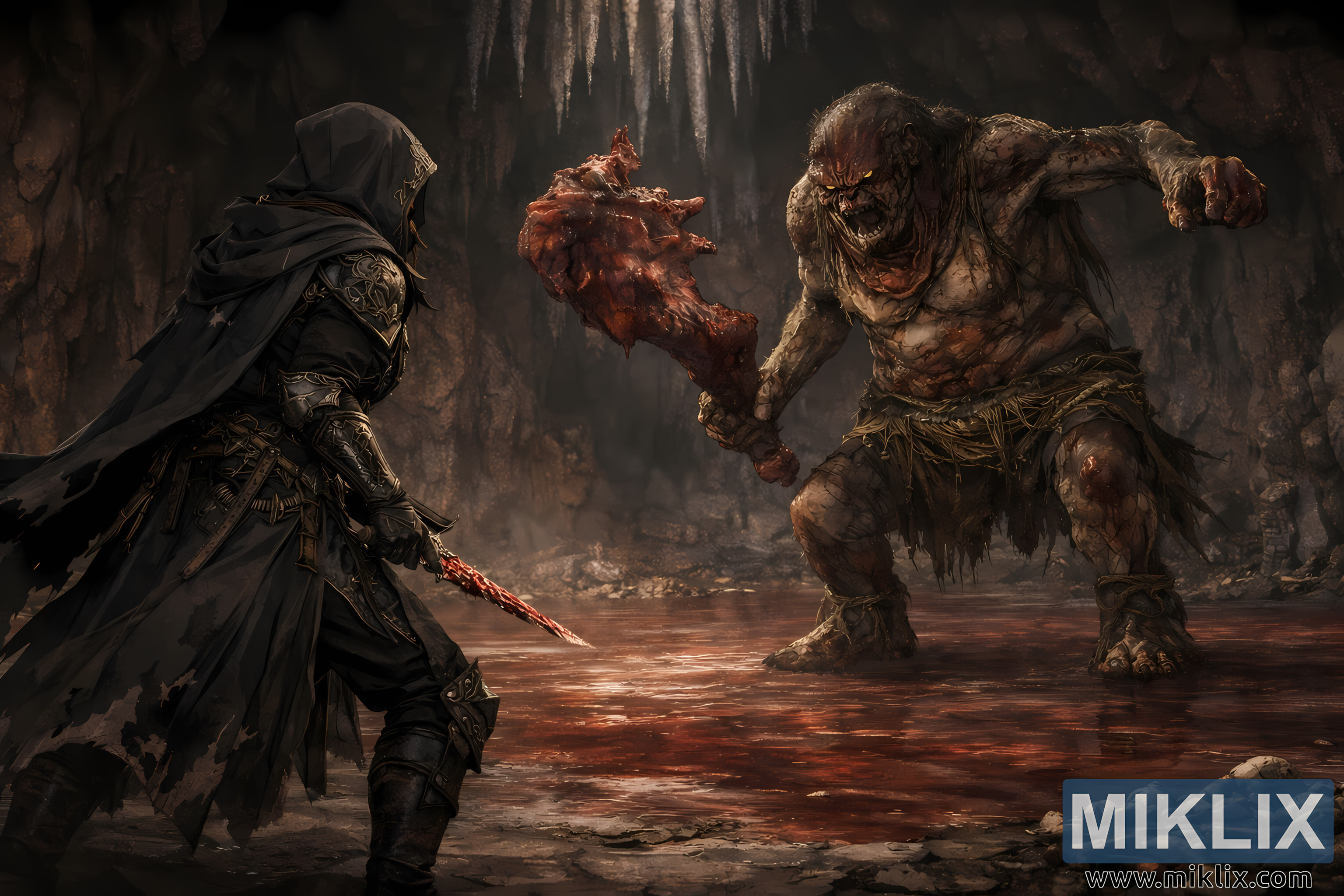 Auf der anderen Seite der Höhle ragt der Oberblutdämon mit furchterregender Präsenz empor. Sein Körper ist aufgedunsen und uneben, die rohen Muskeln liegen unter der zerrissenen, graubraunen Haut hervor. Dicke Sehnenstränge umwickeln seine Arme und seinen Oberkörper wie grobe Fesseln, während Fetzen von verrottetem Stoff und Seil kaum als Rüstung dienen. Das Maul des Monsters ist zu einem wilden Knurren aufgerissen und gibt den Blick auf gezackte, vergilbte Zähne frei, seine Augen brennen mit stumpfer, animalischer Wut. In einer massigen Hand umklammert er eine groteske Keule aus verschmolzenem Fleisch und Knochen, nass und schwer genug, um bei jeder Gewichtsverlagerung Blutspuren zu hinterlassen. Die andere Faust ist zurückgezogen, die Muskeln prall, bereit zum Schlag.