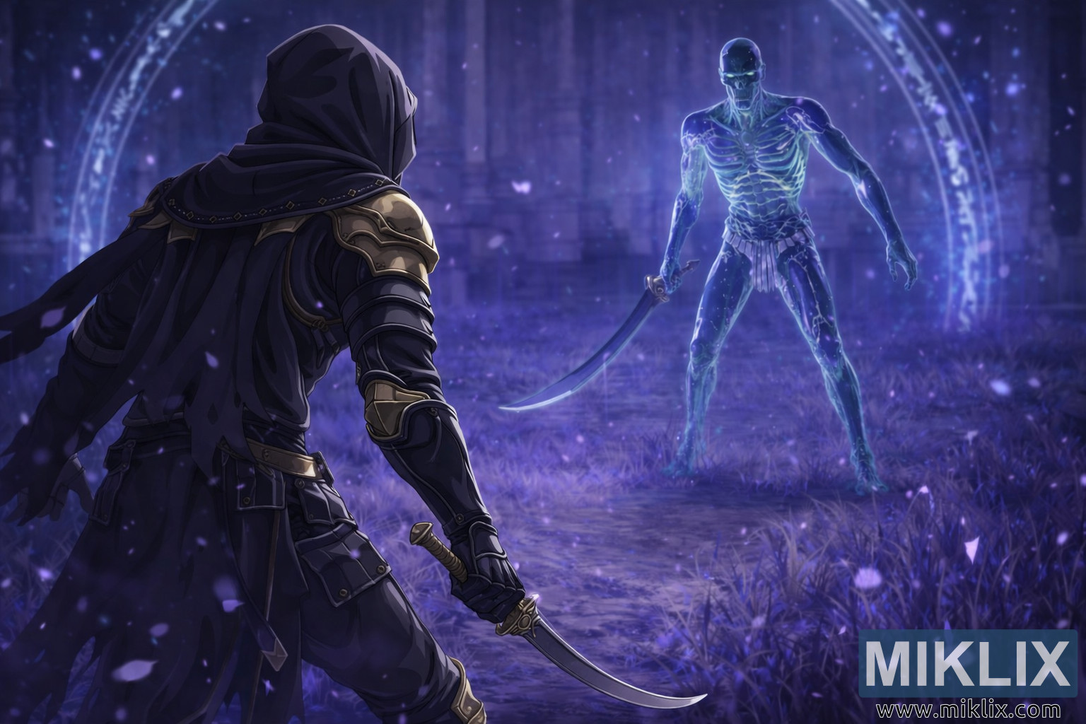Licht und Farbe verleihen der Szene eine einheitliche Wirkung. Kühle Blau- und Violetttöne dominieren die Farbpalette und werfen sanfte Lichtreflexe auf die Kanten der Rüstungen, die Waffen und die Konturen beider Figuren, während Gesichter und feinere Details teilweise verdeckt bleiben. Der starke Kontrast zwischen der dunklen, schattenabsorbierenden Rüstung des Befleckten und der strahlenden, geisterhaften Gestalt des Onyx-Lords unterstreicht visuell den Kampf zwischen Heimlichkeit und arkaner Macht. Insgesamt fängt das Bild einen stillen, atemlosen Moment der Erwartung ein, in dem beide Kämpfer mit wachsamer Absicht vorrücken, im vollen Bewusstsein, dass die nächste Bewegung die Stille in heftige Action verwandeln wird.