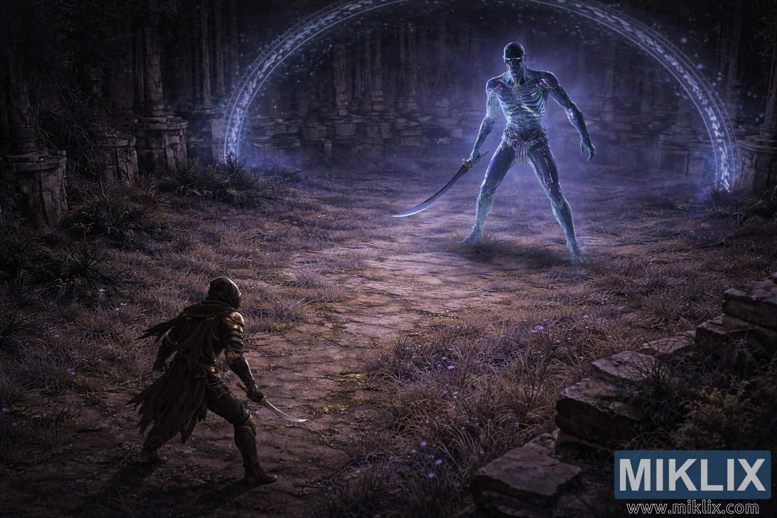 Die isometrische Perspektive enthüllt mehr von der Umgebung des königlichen Grabes im Evergaol. Der Boden zwischen den beiden Figuren erstreckt sich weit und ist mit unebenem Gestein, ausgetretenen Pfaden und spärlichem, violett schimmerndem Gras bedeckt. Das Gelände wirkt rau und uralt, mit subtilen Höhenunterschieden, die aus der Vogelperspektive deutlicher hervortreten. Feine Partikel schweben wie Staub oder Asche durch die Luft, anstatt zu glitzern, und tragen so zu einer realistischen, düsteren Atmosphäre bei. Um die Arena herum befinden sich bröckelnde Steinmauern, zerbrochene Säulen und architektonische Ruinen, die im Schatten und Nebel verschwinden und auf lange Verlassenheit und vergessene Rituale hindeuten.