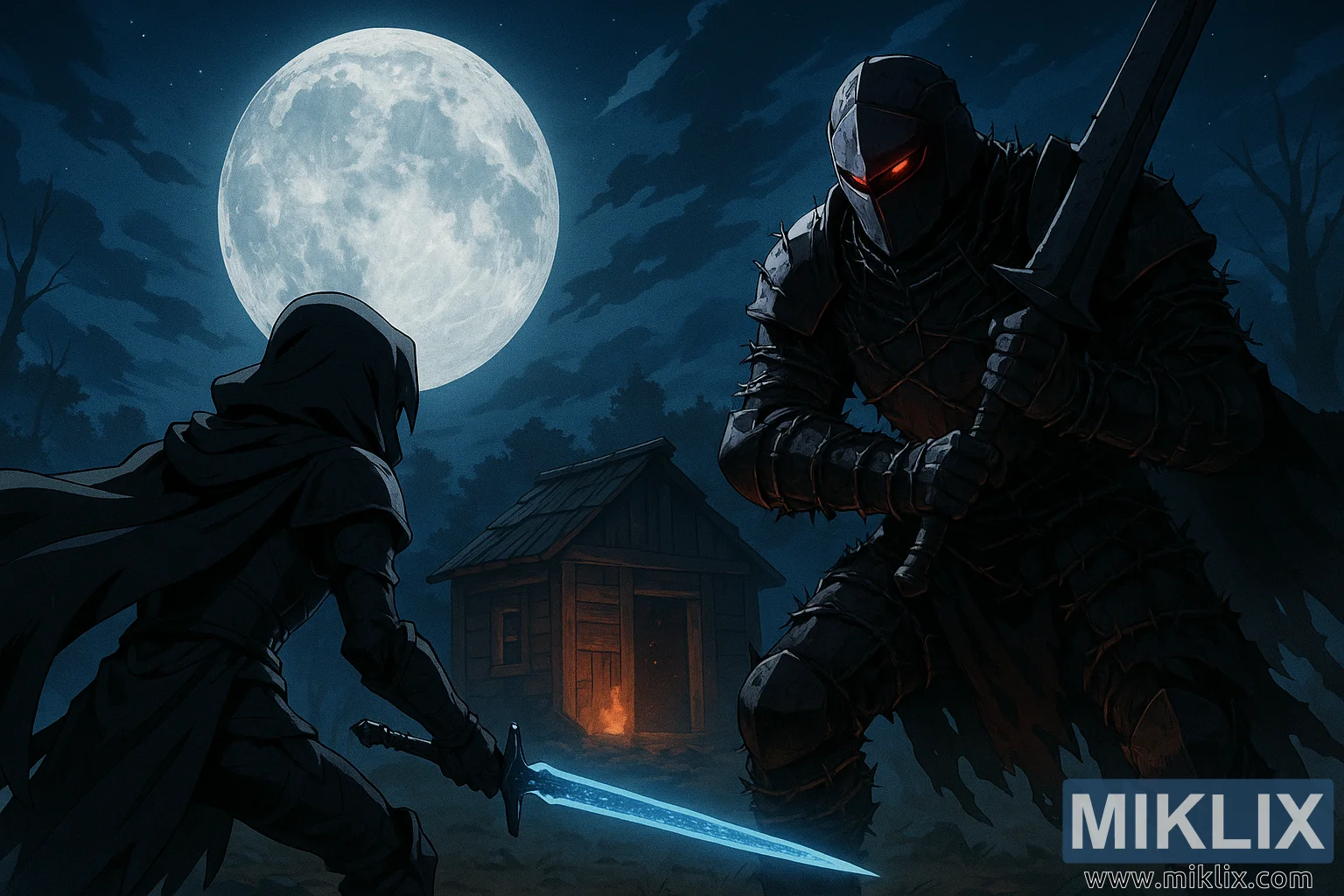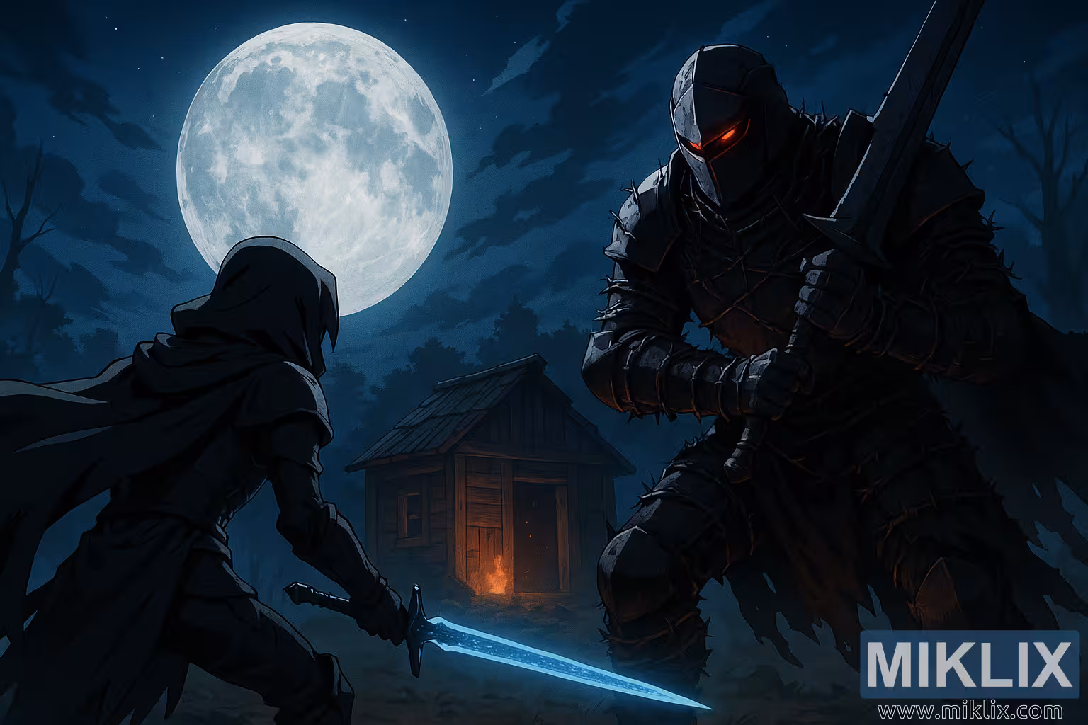 Μια τεταμένη αντιπαράθεση ξεδιπλώνεται σε αυτό το fan art εμπνευσμένο από anime που απεικονίζει μια δραματική συνάντηση από το Elden Ring. Το σκηνικό είναι η Καλύβα του Ερημίτη, μια μοναχική ξύλινη κατασκευή φωλιασμένη βαθιά στο σκοτεινό δάσος, φωτισμένη μόνο από τη ζεστή λάμψη μιας φωτιάς που τρεμοπαίζει από την ανοιχτή πόρτα της. Η καλύβα έχει μερικώς σχηματιστεί, οι άκρες της είναι απαλές και φθαρμένες, τονίζοντας την απομόνωση της τοποθεσίας. Πανύψηλα πεύκα εκτείνονται προς τα πάνω σε έναν ουρανό βαμμένο σε κρύο μπλε φως του φεγγαριού, η νύχτα πυκνή και σιωπηλή, διαταραγμένη μόνο από την επικείμενη σύγκρουση του χάλυβα.