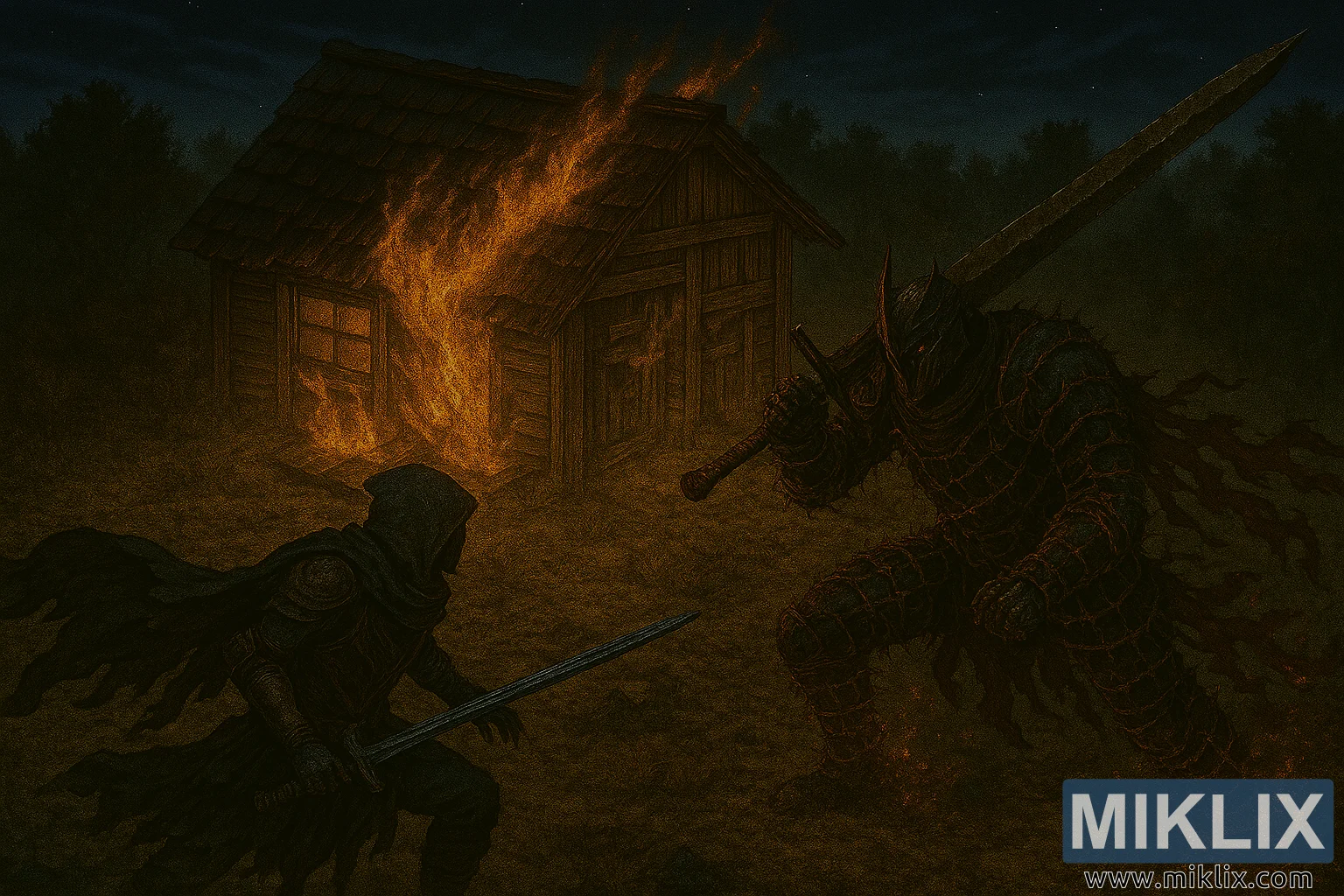 Ένας σκοτεινός ψηφιακός πίνακας φαντασίας αποτυπώνει μια βίαιη νυχτερινή μάχη μεταξύ δύο θωρακισμένων πολεμιστών έξω από την Καλύβα του Ερημίτη Εμπόρων στο Έλντεν Ρινγκ. Το τοπίο είναι άγριο και καμένο, φωτισμένο από τις φλόγες που βρυχώνται και κατακαίνε την ξύλινη καλύβα στο κέντρο της σύνθεσης. Η οροφή της καλύβας καταρρέει, οι ξύλινοι τοίχοι της φλέγονται από το πορτοκαλί και κίτρινο φως της φωτιάς που ρίχνει τρεμοπαίζουσες σκιές στο έδαφος. Πυκνές σιλουέτες δασών πλαισιώνουν το φόντο κάτω από έναν έναστρο ουρανό γεμάτο με παρασυρόμενα σύννεφα.