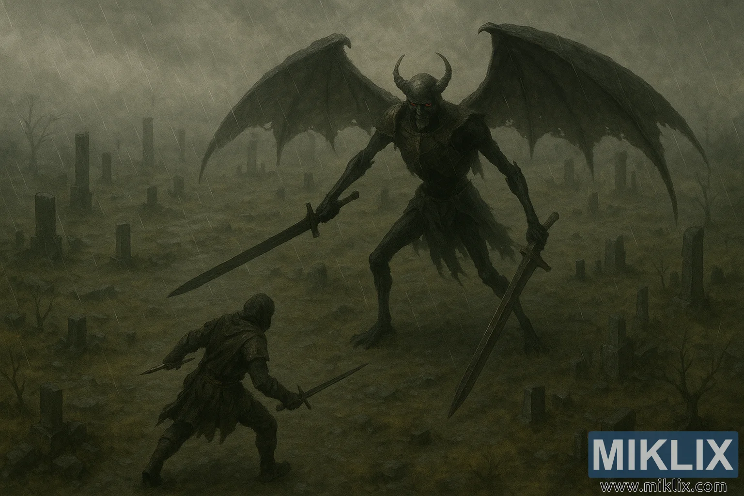 Σκοτεινή φανταστική σκηνή μάχης από πάνω, των Αμαυρωμένων που αντιμετωπίζουν τους Κίντρεντ της Μαύρης Λεπίδας - φθαρμένη πανοπλία κορμού, μαύρα σκελετικά άκρα, ένα μεγάλο σπαθί, μουσκεμένα από τη βροχή ερείπια.
