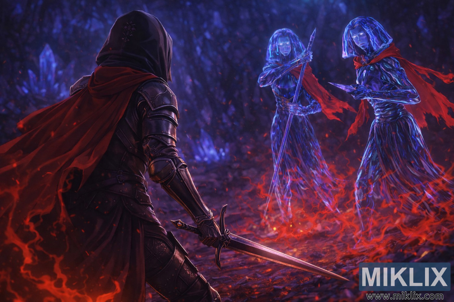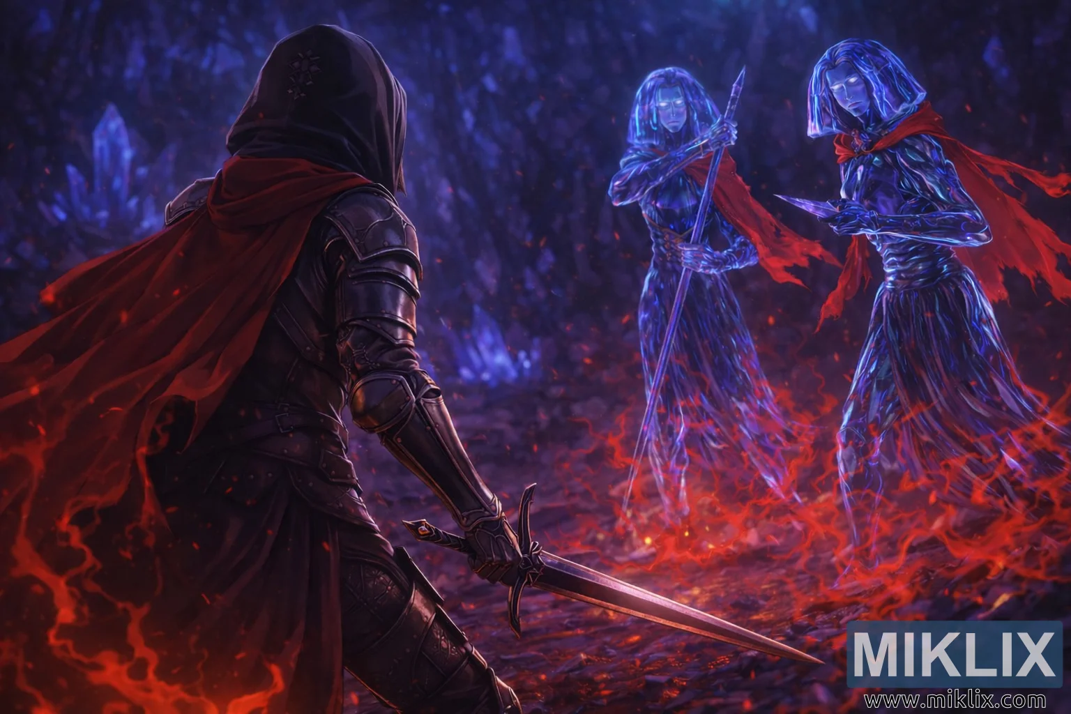 Μικροσκοπικές σπίθες και λαμπερά σωματίδια αιωρούνται στον αέρα, προσθέτοντας βάθος και ατμόσφαιρα. Ο φωτισμός είναι προσεκτικά ισορροπημένος: οι Θαμπωμένοι φωτίζονται από ζεστές κόκκινες ανταύγειες κατά μήκος της πανοπλίας, του μανδύα και του σπαθιού τους, ενώ οι Κρυσταλλιανοί λούζονται σε κρύο, αιθέριο μπλε φως. Η σκηνή αποτυπώνει μια στιγμή αναμονής, όπου κάθε κίνηση φαίνεται να έχει σταματήσει και το βάρος της επερχόμενης μάχης κρέμεται βαρύ στη φωτισμένη από κρυστάλλους σιωπή.
