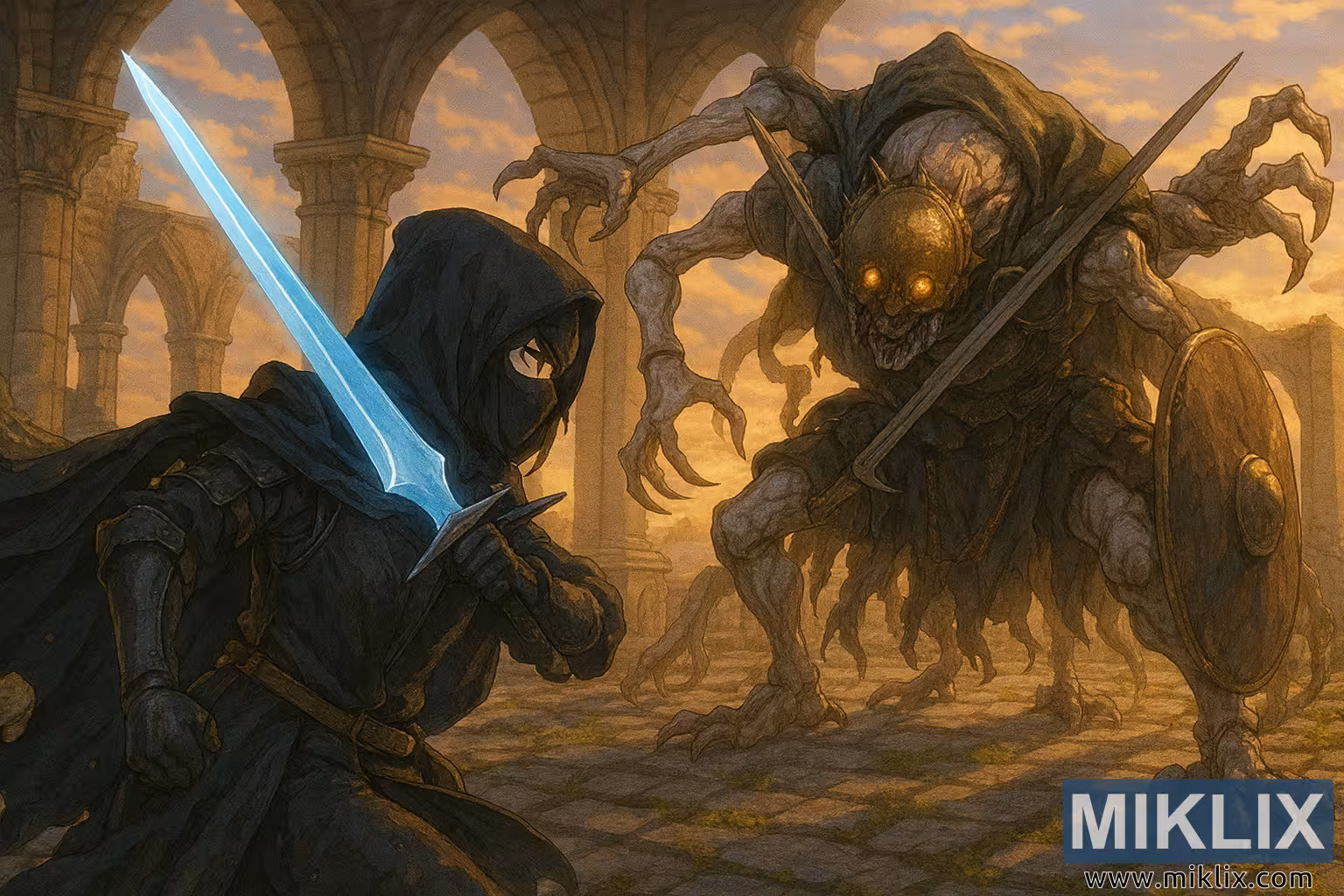 Επική fan art σε στυλ anime από τον Elden Ring που δείχνει την πανοπλία Tarnished in Black Knife να μάχεται με έναν γκροτέσκο Grafted Scion στο Chapel of Anticipation κατά τη δύση του ηλίου.
