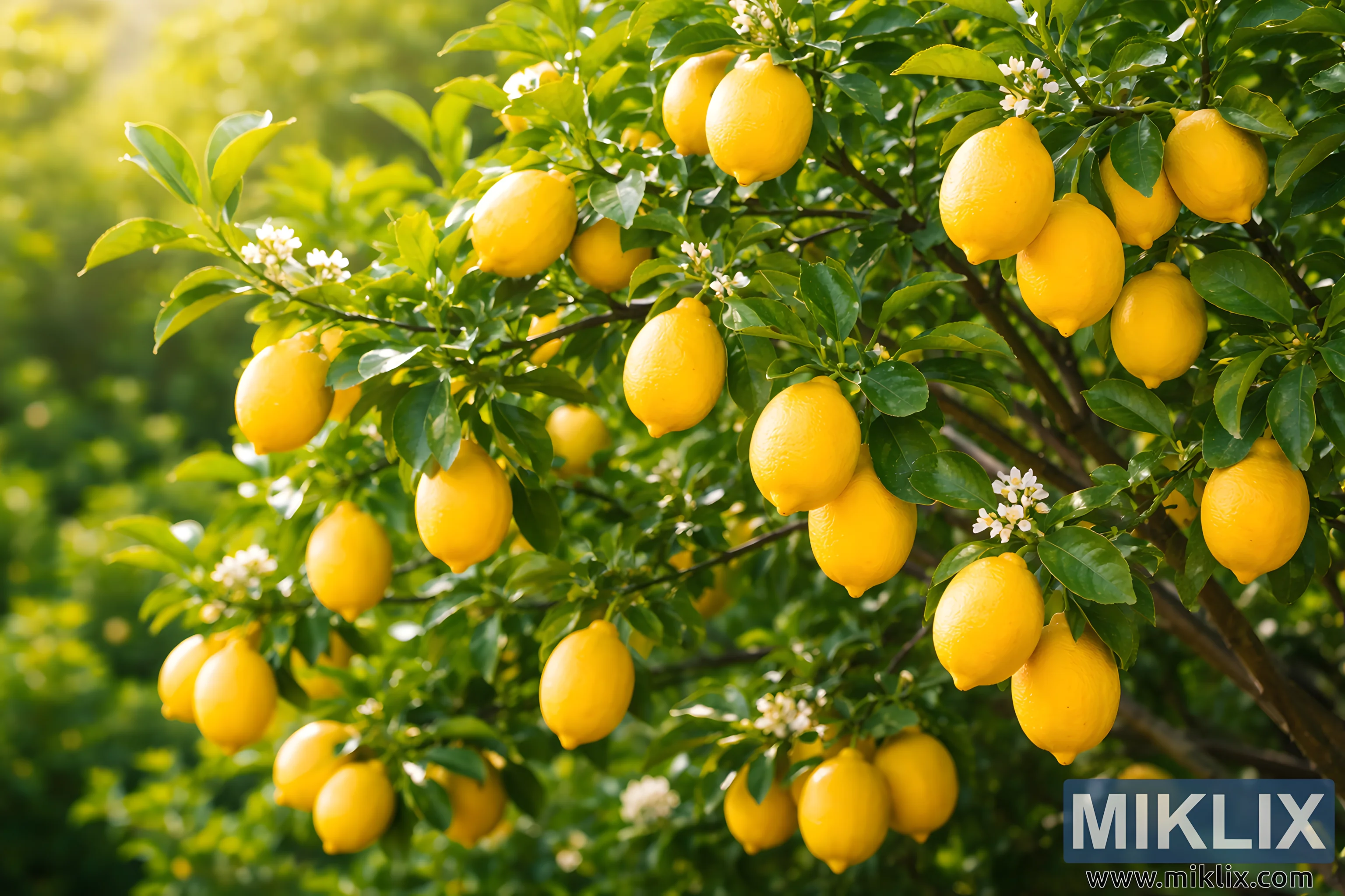 Εικόνα τοπίου υψηλής ανάλυσης μιας λεμονιάς Meyer γεμάτης ώριμα κίτρινα φρούτα και ντελικάτα λευκά άνθη, φωτισμένη από ζεστό φυσικό ηλιακό φως σε έναν καταπράσινο κήπο.