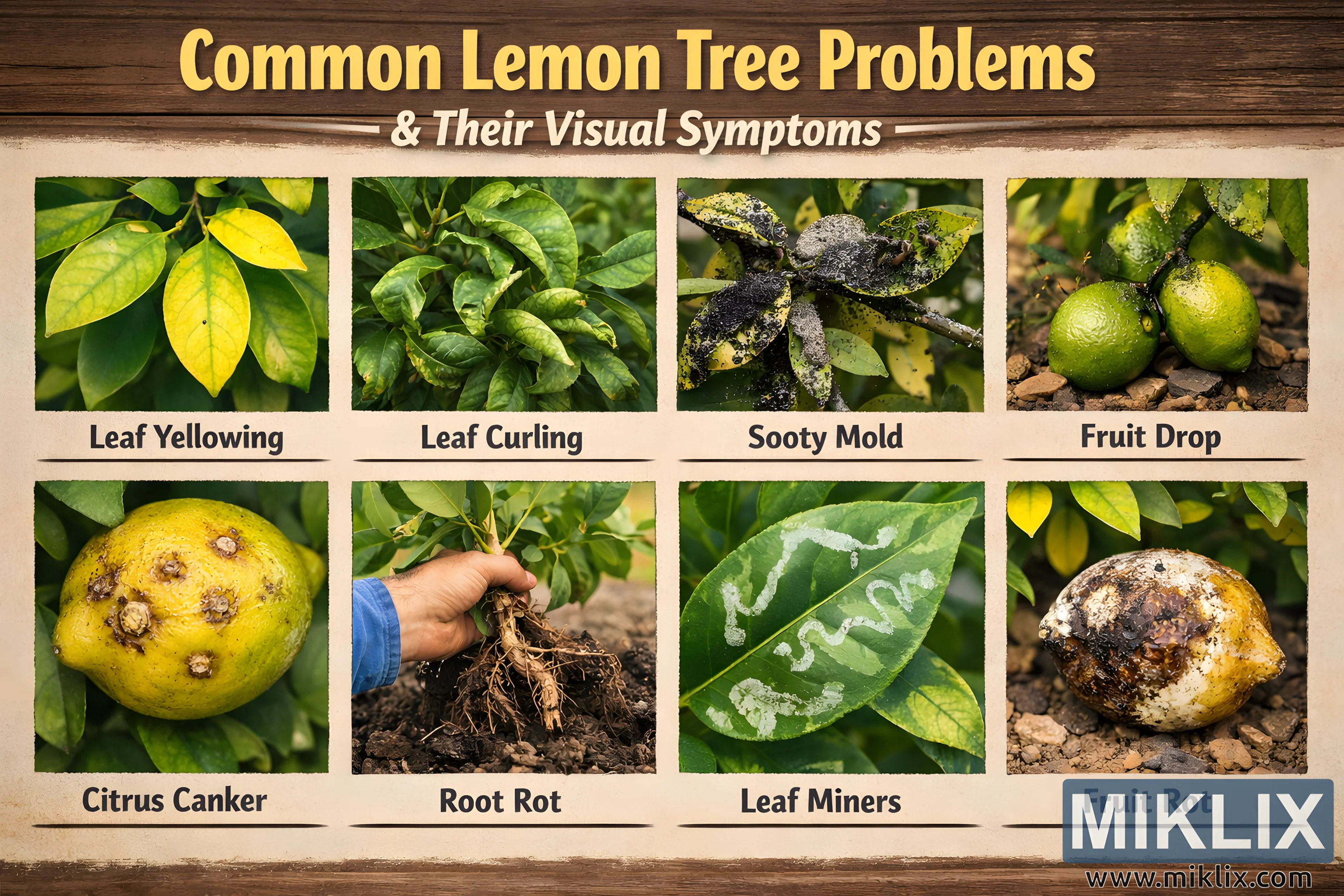 Η εικόνα είναι ένα ευρύ, εκπαιδευτικό infographic με προσανατολισμό στο τοπίο με τίτλο "Συνηθισμένα προβλήματα λεμονιάς και τα οπτικά τους συμπτώματα". Έχει σχεδιαστεί με μια ρουστίκ αισθητική με θέμα την κηπουρική, με μια κεφαλίδα με ξύλινη υφή και ένα ανοιχτόχρωμο φόντο σαν περγαμηνή που πλαισιώνει ένα πλέγμα από φωτογραφικά παραδείγματα με ετικέτες. Το infographic είναι οργανωμένο σε οκτώ ομοιόμορφα κατανεμημένα πάνελ διατεταγμένα σε δύο οριζόντιες σειρές των τεσσάρων εικόνων το καθένα, καθιστώντας το περιεχόμενο εύκολο στη σάρωση και τη σύγκριση. Στο επάνω μέρος, ο μεγάλος τίτλος χρησιμοποιεί έντονα, ζεστά κίτρινα γράμματα για τον κύριο τίτλο και έναν μικρότερο, αντίθετο υπότιτλο από κάτω, καθιερώνοντας σαφώς το θέμα ως έναν οπτικό οδηγό για τη διάγνωση προβλημάτων υγείας της λεμονιάς. Κάθε πάνελ περιέχει μια φωτογραφία υψηλής ποιότητας, σε κοντινή απόσταση ενός προβλήματος λεμονιάς, σε συνδυασμό με μια σαφή, έντονη ετικέτα από κάτω που κατονομάζει το πρόβλημα. Το πρώτο πάνελ, με την ένδειξη "Κίτρινο φύλλων", δείχνει φύλλα λεμονιάς να γίνονται ανοιχτό κίτρινο, υποδηλώνοντας ελλείψεις θρεπτικών συστατικών ή στρες ποτίσματος. Στη συνέχεια, το "Κατσαρίσματα φύλλων" απεικονίζει φύλλα που είναι στριμμένα και παραμορφωμένα, τονίζοντας οπτικά το στρες που προκαλείται από παράσιτα, ασθένειες ή περιβαλλοντικούς παράγοντες. Το τρίτο πάνελ, "Sooty Mold", παρουσιάζει φύλλα επικαλυμμένα με ένα σκούρο, μαυρισμένο υπόλειμμα, που απεικονίζει την ανάπτυξη μυκήτων που συνήθως σχετίζεται με έντομα που ρουφούν χυμό. Το τέταρτο πάνελ, "Fruit Drop", δείχνει ανώριμα πράσινα λεμόνια που βρίσκονται στο χώμα κάτω από ένα δέντρο, επισημαίνοντας την πρόωρη απώλεια καρπών. Η δεύτερη σειρά ξεκινά με το "Citrus Canker", που απεικονίζει έναν καρπό λεμονιάς καλυμμένο με ανυψωμένες, καφέ, φελλώδεις αλλοιώσεις που σηματοδοτούν βακτηριακή λοίμωξη. Το πάνελ "Root Root Root" δείχνει ένα χέρι που τραβάει μια μικρή λεμονιά από το έδαφος, εκθέτοντας κατεστραμμένες, σκουρόχρωμες ρίζες για να επικοινωνήσει οπτικά ασθένειες που μεταδίδονται από το έδαφος και κακή αποστράγγιση. Στη συνέχεια, το "Leaf Miners" παρουσιάζει ένα φύλλο με χλωμά, ελικοειδείς ίχνη, δείχνοντας ξεκάθαρα τα οφιοειδή μοτίβα που προκαλούνται από προνύμφες εντόμων που τρέφονται μέσα στον ιστό των φύλλων. Το τελευταίο πάνελ, "Fruit Rot", απεικονίζει ένα σάπιο λεμόνι με αποχρωματισμένες, μουχλιασμένες κηλίδες, δίνοντας έμφαση στη μυκητιακή ή βακτηριακή σήψη που επηρεάζει τα ώριμα φρούτα. Συνολικά, η εικόνα λειτουργεί ως μια σαφής, πρακτική αναφορά για τους κηπουρούς και τους καλλιεργητές, χρησιμοποιώντας ρεαλιστική φωτογραφία, συνεπή επισήμανση και μια οργανωμένη διάταξη για να βοηθήσει τους θεατές να αναγνωρίζουν και να διαφοροποιούν γρήγορα τα κοινά προβλήματα των λεμονιών με βάση τα ορατά συμπτώματα.