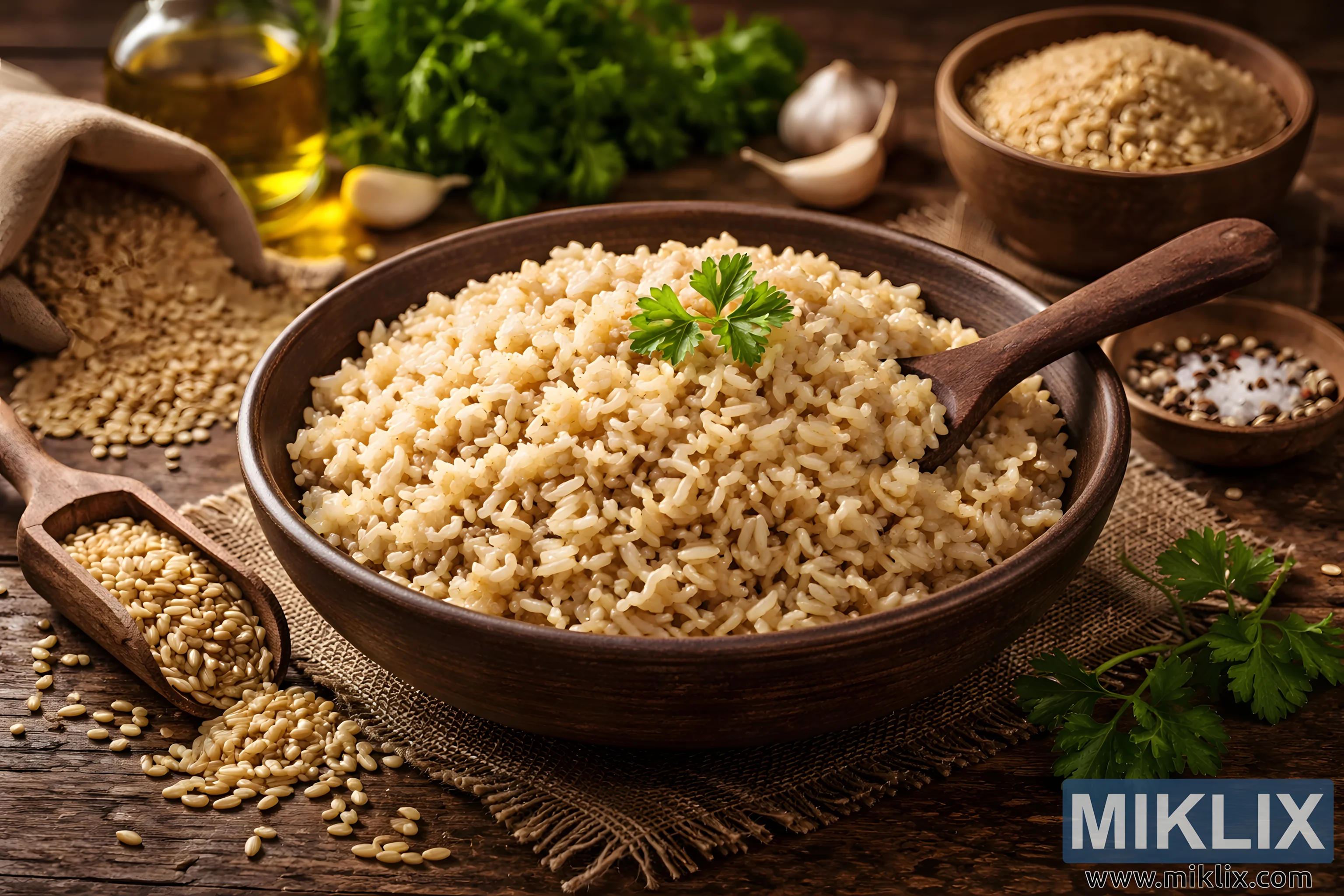 Γύρω από το κυρίως μπολ υπάρχουν προσεκτικά τοποθετημένα υλικά που ενισχύουν την ρουστίκ αφήγηση της κουζίνας. Στα αριστερά, μια μικρή υφασμάτινη σακούλα έχει χύσει άβραστο καστανό ρύζι στο τραπέζι, με τους ωμούς κόκκους σκορπισμένους σε ένα απλό, οργανικό μοτίβο. Μπροστά της βρίσκεται μια ξύλινη κουτάλα γεμάτη με περισσότερο ρύζι, αντανακλώντας τις υφές και τα χρώματα του μπολ και του κουταλιού. Πίσω από το μπολ, ένα γυάλινο μπουκάλι με χρυσό ελαιόλαδο λούζει το ζεστό φως, ενώ φρέσκες σκελίδες σκόρδο και ένα φυλλώδες ματσάκι μαϊντανό προσθέτουν φωτεινότητα και αντίθεση στην κατά τα άλλα ουδέτερη παλέτα.