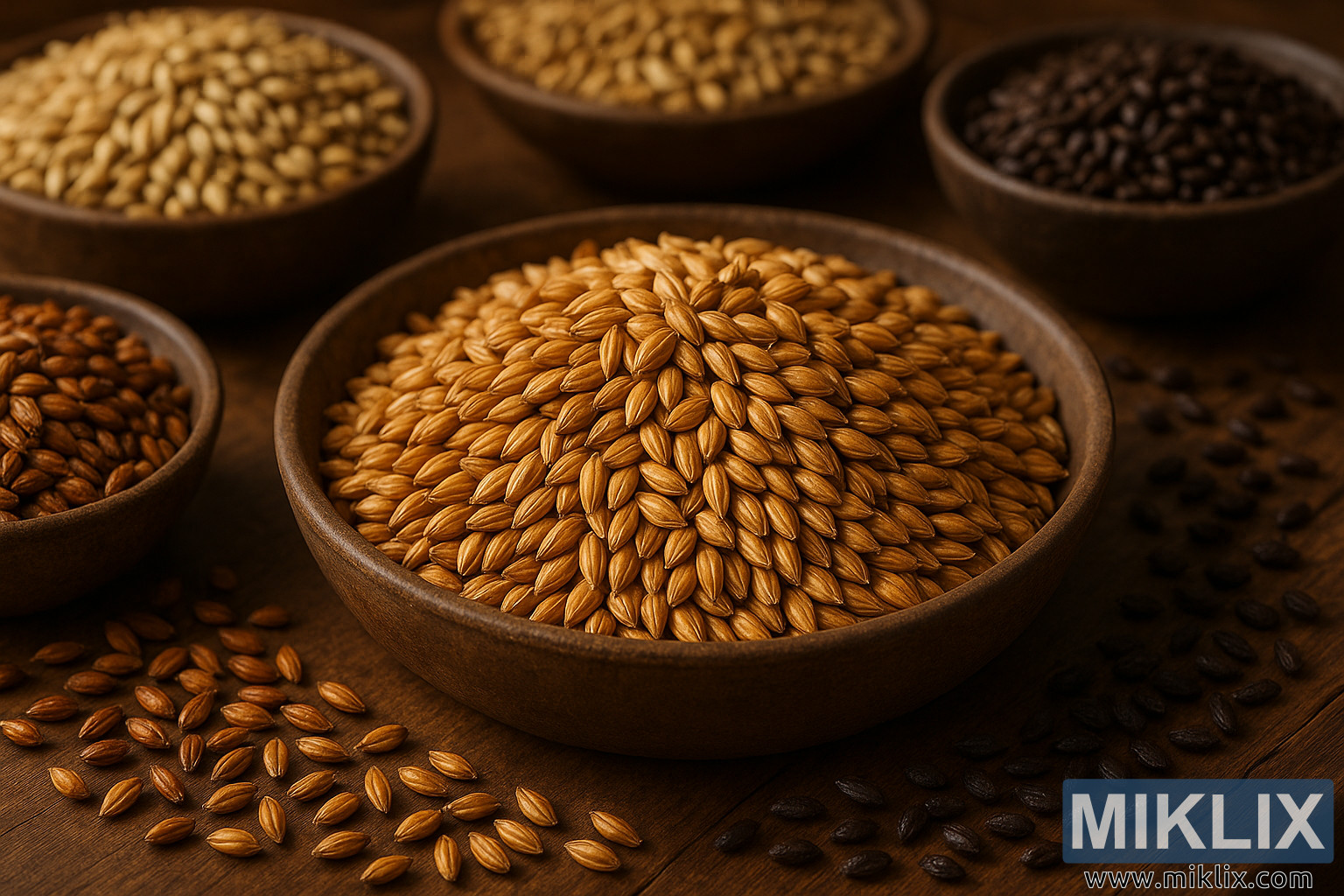 Γύρω από το κεντρικό μπολ υπάρχουν μικρότερα δοχεία γεμάτα με μια γκάμα από ειδικές βύνες - καραμέλα, Μόναχο, σοκολάτα και καβουρδισμένες ποικιλίες - καθεμία από τις οποίες προσφέρει μια ξεχωριστή απόχρωση και απτική ποιότητα. Η βύνη καραμέλας λάμπει με μια απαλή χάλκινη λάμψη, οι κόκκοι της ελαφρώς πιο σκούροι και πιο εύθραυστοι, υπόσχοντας γλυκύτητα και σώμα. Η βύνη σοκολάτας, σχεδόν μαύρη, απορροφά το φως αντί να το αντανακλά, με την ματ επιφάνειά της να υποδηλώνει έντονο καβούρδισμα και νότες κακάο ή καφέ. Οι διάσπαρτοι κόκκοι χύνονται απαλά στο τραπέζι, σπάζοντας τη συμμετρία και προσθέτοντας μια πινελιά αυθορμητισμού στην κατά τα άλλα σκόπιμη διάταξη. Αυτοί οι αδέσποτοι κόκκοι, φωλιασμένοι στις φυσικές αυλακώσεις του ξύλου, ενισχύουν την απτική οικειότητα της σκηνής.