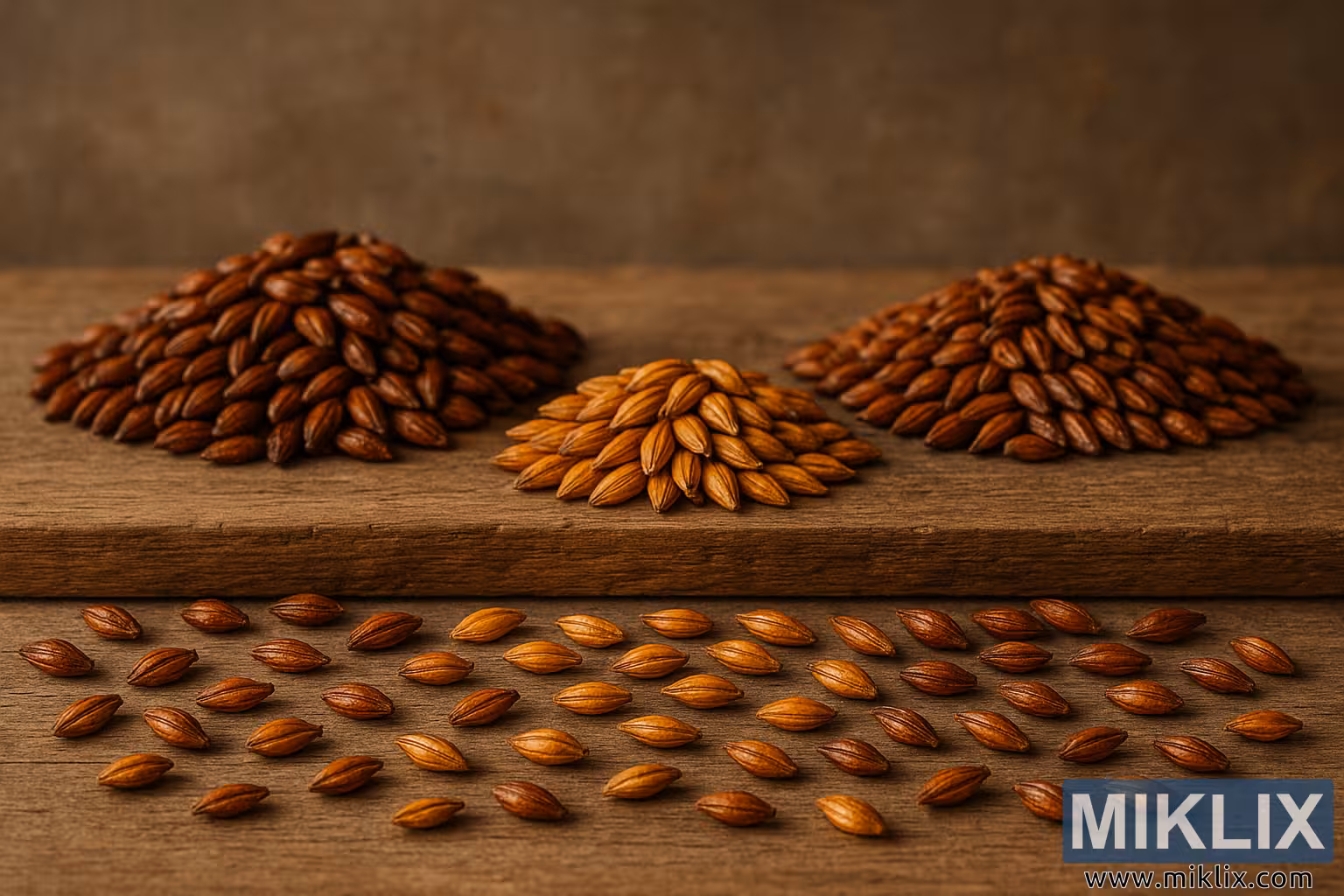 Απλωμένη σε μια φθαρμένη ξύλινη επιφάνεια, η σκηνή ξεδιπλώνεται σαν ένας ήσυχος φόρος τιμής στην τέχνη της ζυθοποιίας. Το τραπέζι, με τους ορατούς κόκκους και τη ζεστή πατίνα του, θέτει το σκηνικό για μια οπτική μελέτη της ποικιλομορφίας και της ακρίβειας της βύνης. Στην καρδιά της σύνθεσης βρίσκονται τρεις ξεχωριστοί σωροί βύνης Μονάχου, ο καθένας με μια διακριτική ποικιλία σε απόχρωση και χαρακτήρα. Οι κόκκοι κυμαίνονται από απαλό κεχριμπαρένιο έως βαθύ καστανό, με τις αποχρώσεις τους να σχηματίζουν μια φυσική κλίση που μιλάει για τις λεπτές διαδικασίες καβουρδίσματος και ξήρανσης που καθορίζουν τα γευστικά τους προφίλ. Αυτές δεν είναι τυχαίες ποικιλίες - είναι επιμελημένες επιλογές, κάθε σωρός αντιπροσωπεύει ένα διαφορετικό στάδιο ανάπτυξης της βύνης, μια διαφορετική δυνατότητα για βάθος, γλυκύτητα και πολυπλοκότητα στο τελικό ρόφημα.