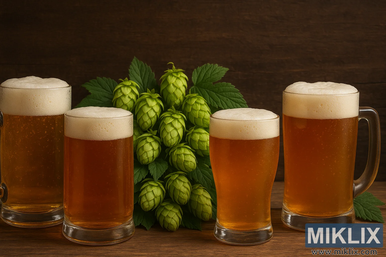 Στο προσκήνιο, τέσσερα ποτήρια μπύρας στέκονται περήφανα, το καθένα γεμάτο με χρυσαφένιο έως κεχριμπαρένιο υγρό που παγιδεύει το ζεστό φως. Οι μπύρες είναι ζωντανές με αφρισμό, μικροσκοπικά ρεύματα φυσαλίδων που ανεβαίνουν συνεχώς στην επιφάνεια όπου σχηματίζονται και παραμένουν παχιές, αφρώδεις κεφαλές. Ο αφρός τους είναι πυκνός και ελκυστικός, προσκολλημένος απαλά στο ποτήρι σαν να υπόσχεται μια απαλή αίσθηση στο στόμα και μια ικανοποιητική γουλιά. Η γκάμα των χρωμάτων μέσα στις μπύρες - βαθύ χρυσό, χάλκινο και ανοιχτό κεχριμπαρένιο - αναδεικνύει την ευελιξία του λυκίσκου Cascade, του οποίου το γευστικό προφίλ μπορεί να λάμψει σε ένα ευρύ φάσμα στυλ. Είτε σε μια τραγανή απαλή μπύρα, μια έντονη IPA, είτε ακόμα και σε μια κεχριμπαρένια μπύρα με έντονη γεύση λυκίσκου, η Cascade έχει την αξιοσημείωτη ικανότητα να προσαρμόζεται, με τις χαρακτηριστικές εσπεριδοειδή και λουλουδάτες ιδιότητές της να συνδυάζουν την πολυπλοκότητα με τις ραχοκοκαλιές βύνης ποικίλων εντάσεων.