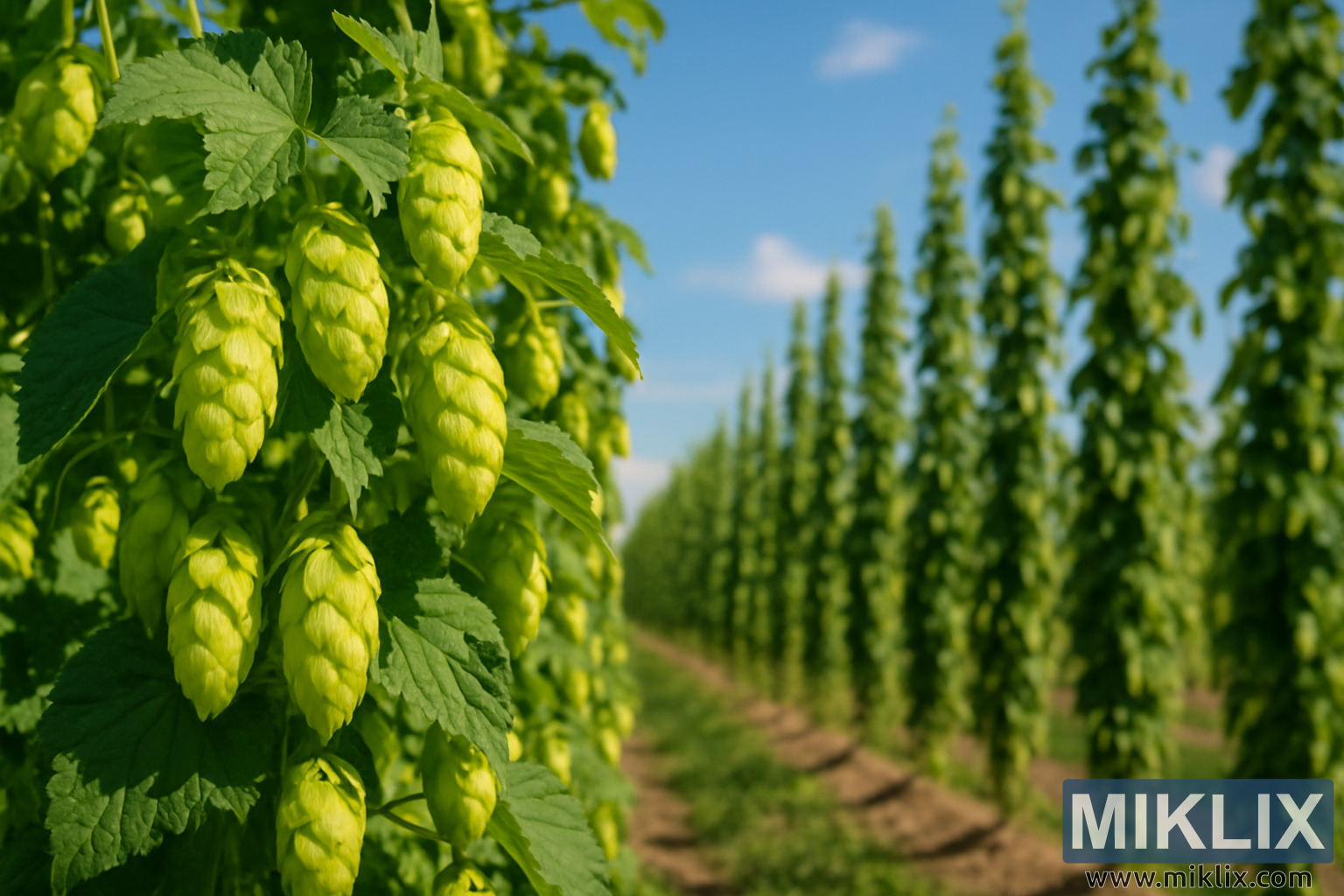 Πάνω από το χωράφι εκτείνεται ένας καταγάλανος ουρανός με λίγα μόνο απαλά, διάσπαρτα σύννεφα. Η απλότητα του ουρανού στρέφει την προσοχή πίσω στον ίδιο τον λυκίσκο, ενισχύοντας την αίσθηση της ανοιχτότητας και της αγροτικής ηρεμίας. Τα έντονα πράσινα, η φυσική συμμετρία των σειρών και το δυνατό ηλιακό φως μαζί μεταφέρουν μια αίσθηση αφθονίας και υγιούς ανάπτυξης. Συνολικά, η σκηνή αποτυπώνει τόσο την γεωργική ακρίβεια της καλλιέργειας λυκίσκου όσο και την οργανική ομορφιά των φυτών, αναδεικνύοντας τους χαρακτηριστικούς κώνους και τις πανύψηλες κάθετες μορφές που κάνουν τα χωράφια λυκίσκου οπτικά εντυπωσιακά.
