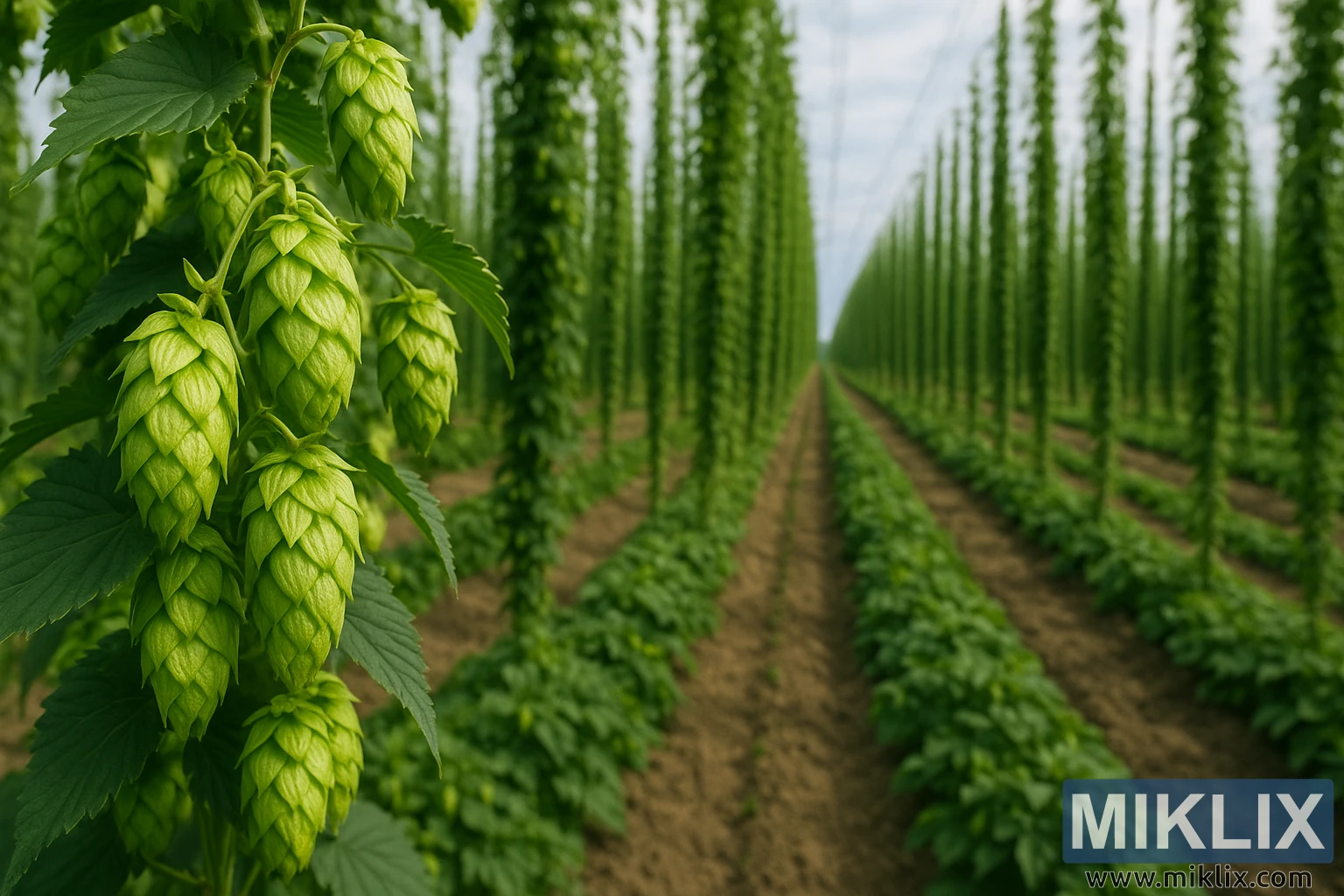 Η ατμόσφαιρα είναι φωτεινή αλλά διάχυτη, υποδηλώνοντας ήπιο φως ημέρας - πιθανώς έναν ελαφρώς συννεφιασμένο ουρανό που απαλύνει τις σκιές και ενισχύει τους φυσικούς χρωματικούς τόνους. Η συνολική παλέτα κυριαρχείται από καταπράσινα πράσινα, που κυμαίνονται από τις βαθιές αποχρώσεις των ώριμων φύλλων έως το πιο ανοιχτό, πιο λεπτό πράσινο των κώνων λυκίσκου. Λεπτές καφέ αποχρώσεις του εδάφους και αχνά μπλε του ουρανού στο μακρινό φόντο ολοκληρώνουν τη φυσική χρωματική αρμονία. Η εικόνα μεταφέρει μια αίσθηση αφθονίας, ανάπτυξης και γεωργικής ακρίβειας, καθώς και τη χαρακτηριστική ομορφιά ενός καλοδιατηρημένου χωραφιού λυκίσκου. Αναδεικνύει τόσο τη μακρο λεπτομέρεια των μεμονωμένων κώνων όσο και τη μεγάλη κλίμακα της εμπορικής καλλιέργειας λυκίσκου, καθιστώντας την μια υποβλητική αναπαράσταση του λυκίσκου Merkur στο φυσικό τους περιβάλλον.