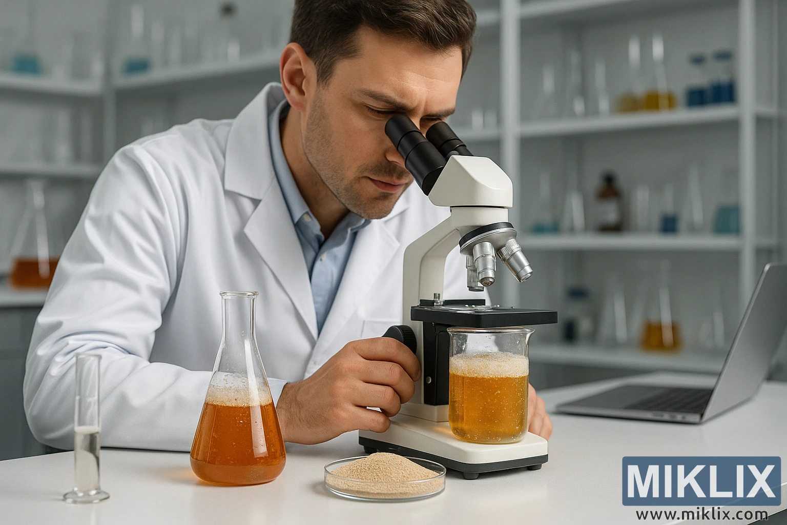 Μια σκηνή εργαστηρίου ζυθοποιίας με έναν τεχνικό με λευκή ρόμπα να χρησιμοποιεί μικροσκόπιο για να αναλύσει ένα δείγμα ζύμης, περιτριγυρισμένο από φιάλες, κυλίνδρους και εργαστηριακά εργαλεία.