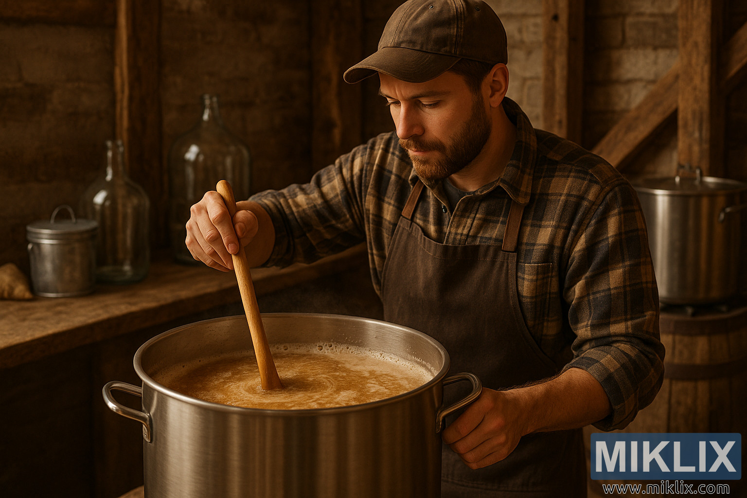 La imagen retrata un ambiente rústico y acogedor para la elaboración de cerveza casera, donde el protagonista es un cervecero casero trabajando, removiendo cuidadosamente el puré que algún día se convertirá en cerveza lager. El cervecero, un hombre de unos 30 años con una barba bien recortada, viste una camisa de franela a cuadros bajo un delantal marrón oscuro. Una gorra sencilla le protege el rostro, y su expresión transmite una concentración serena, la mirada de alguien profundamente comprometido con la artesanía y el proceso. Sus manos son firmes: una sujeta firmemente el asa de una gran olla de acero inoxidable, mientras que la otra guía una larga pala de madera para macerar a través del líquido espumoso y arremolinado.