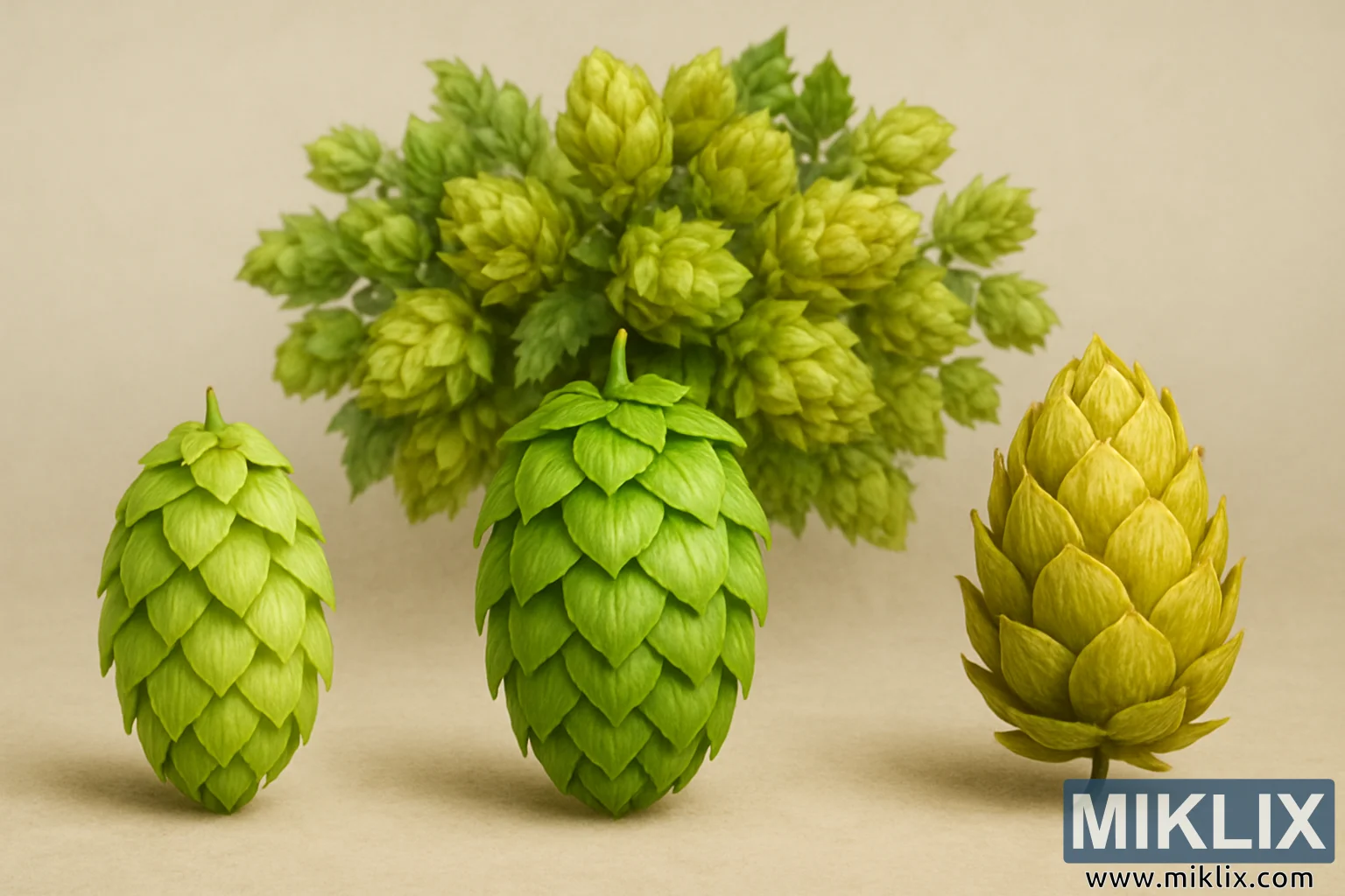 El fondo neutro sirve como un lienzo perfecto para esta exhibición. Sus suaves tonos beige se desvanecen discretamente en la distancia, asegurando que la atención del espectador se centre en el lúpulo. Al eliminar detalles superfluos, el entorno permite que las intrincadas texturas de los conos brillen: la delicada superposición de brácteas, las suaves curvas de cada escama y la sugestión de los aceites ricos en lupulina que esconden. La simplicidad del fondo también eleva los conos de sus orígenes agrícolas a objetos casi icónicos, animando al espectador a verlos no solo como ingredientes, sino como símbolos de artesanía, sabor y tradición.