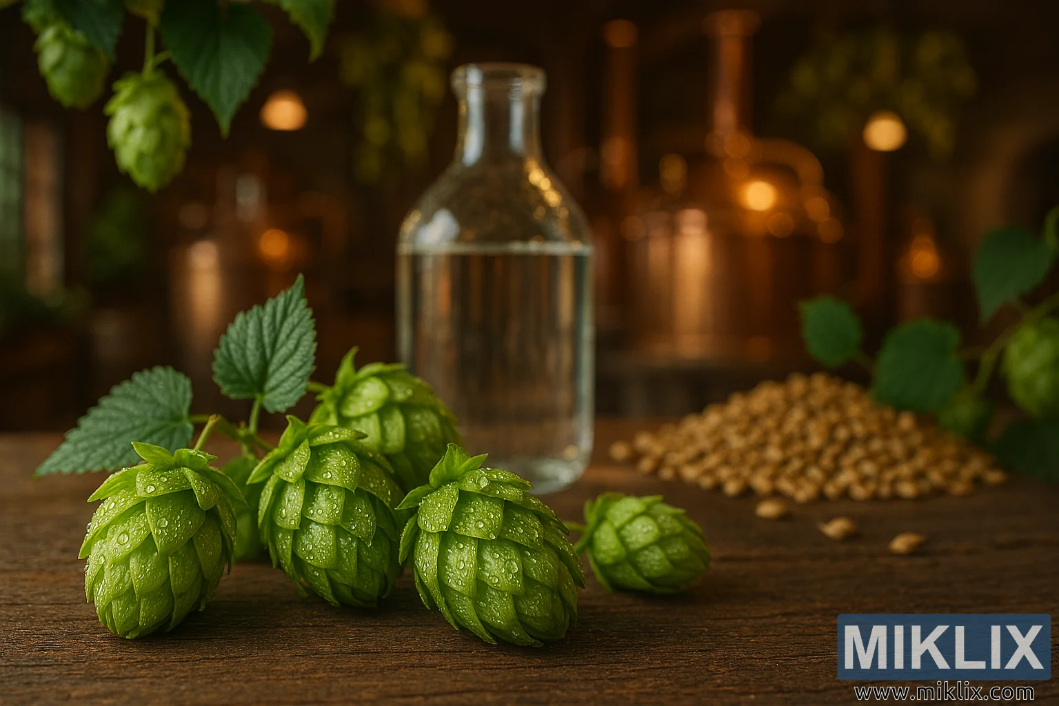 El plano medio introduce el contexto cervecero: una garrafa de vidrio transparente llena de agua clara se encuentra ligeramente detrás del lúpulo; su superficie curva refleja la luz ambiental. A su lado, una generosa pila de granos de cebada dorados se extiende sobre la mesa, insinuando los ingredientes esenciales para el proceso cervecero. La veta de la madera de la mesa es visible y táctil, contribuyendo a su encanto rústico.