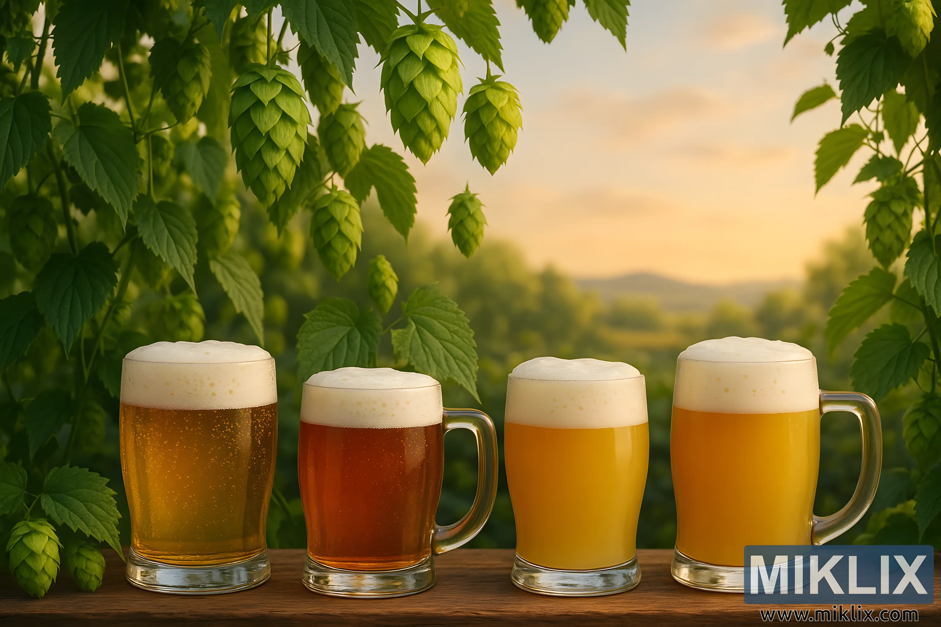 lo lejos, el paisaje se extiende hacia ondulantes colinas suavizadas por el resplandor de la hora dorada. El horizonte es suave, salpicado de árboles que se disuelven en la bruma del sol del atardecer. El cielo, en lo alto, se tiñe de tonos melocotón y ámbar, evocando los mismos colores que se ven en los vasos de abajo, unificando el mundo natural con la artesanía humana que inspira. El fondo difuminado ofrece serenidad, pero también sitúa la escena en un lugar real, quizás una región de cultivo de lúpulo donde el ciclo de cultivo, cosecha y elaboración de cerveza es un ritmo tan antiguo como la tierra misma. Las colinas transmiten una sensación de atemporalidad, como si generaciones de cerveceros y agricultores hubieran estado en campos similares, maravillándose ante el milagro de la transformación que convierte humildes conos verdes en oro líquido.
