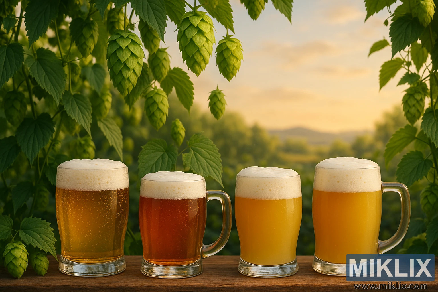 La imagen se despliega como una celebración del lúpulo y su transformación desde la cebada hasta el vaso, un cuadro cuidadosamente compuesto que une la exuberancia de la agricultura con el arte de la elaboración de cerveza. En primer plano, cuatro jarras de cerveza negra rebosantes de IPAs de diversas expresiones se alinean sobre una rústica superficie de madera. Cada cerveza tiene su propia identidad: una brilla con un brillo dorado, efervescente y cristalina, con su carbonatación subiendo constantemente bajo una espuma firme y esponjosa; otra luce un tono ámbar más profundo, casi cobrizo, que sugiere la complejidad de la malta entrelazada con el amargor asertivo del lúpulo; la tercera irradia la neblina del jugo sin filtrar, y su cremosa corona promete una sinfonía de sabores tropicales y cítricos; mientras que la última, una IPA turbia ligeramente más ligera pero igualmente opaca, parece deleitarse en su turbidez, encarnando la preferencia moderna por las cervezas con cuerpo y saturadas de lúpulo. Estas tazas, con sus resistentes asas y vidrio grueso, no son simplemente recipientes sino símbolos de convivencia, cada una de las cuales invita al espectador a levantar, beber y saborear la artesanía que contienen.
