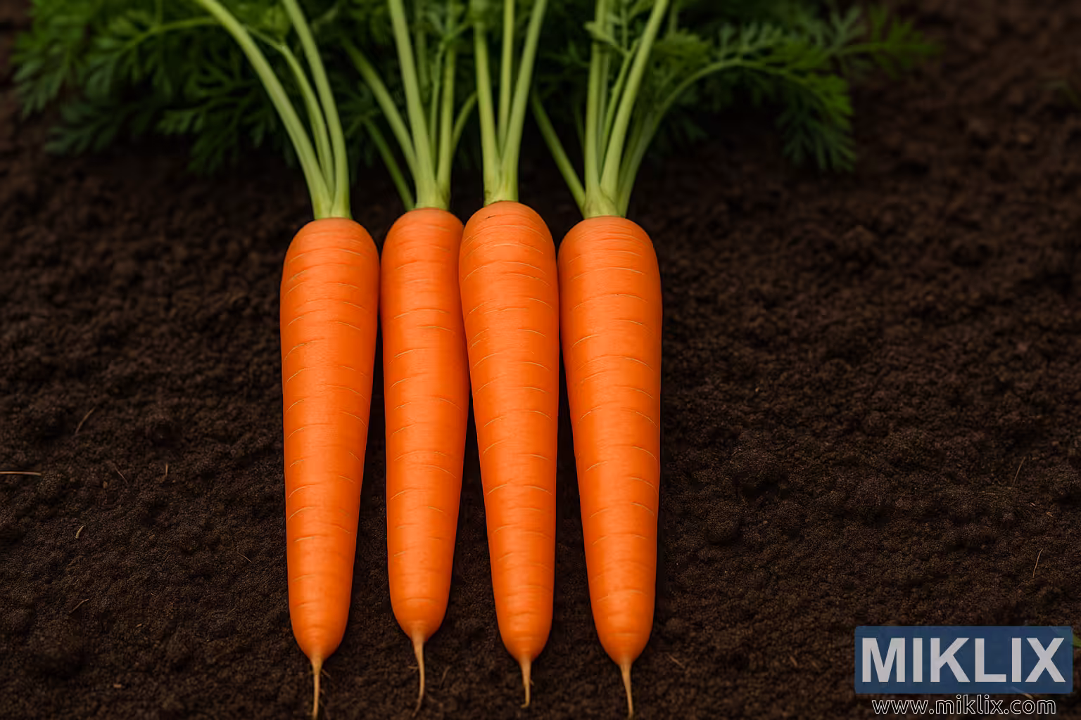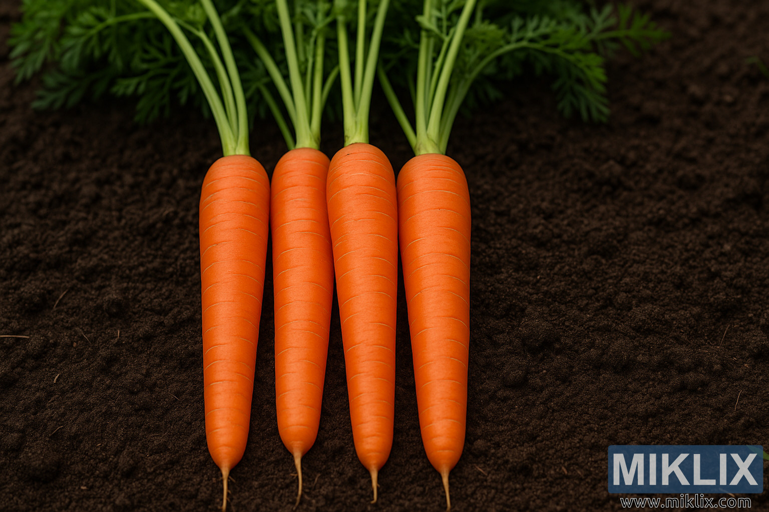 Esta imagen presenta una fotografía horizontal de alta resolución que muestra cuatro zanahorias Nantes recién cosechadas, ordenadas una junto a la otra sobre un lecho de tierra rica y oscura. Las zanahorias muestran las características distintivas de la variedad Nantes: cuerpos lisos y cilíndricos con puntas ligeramente ahusadas y un color naranja brillante y vibrante que contrasta con la tierra marrón oscuro que las rodea. Sus superficies se ven limpias y de forma uniforme, con tenues anillos de crecimiento naturales que rodean sutilmente cada raíz, lo que realza la textura uniforme y la simetría general típicas de este cultivar.